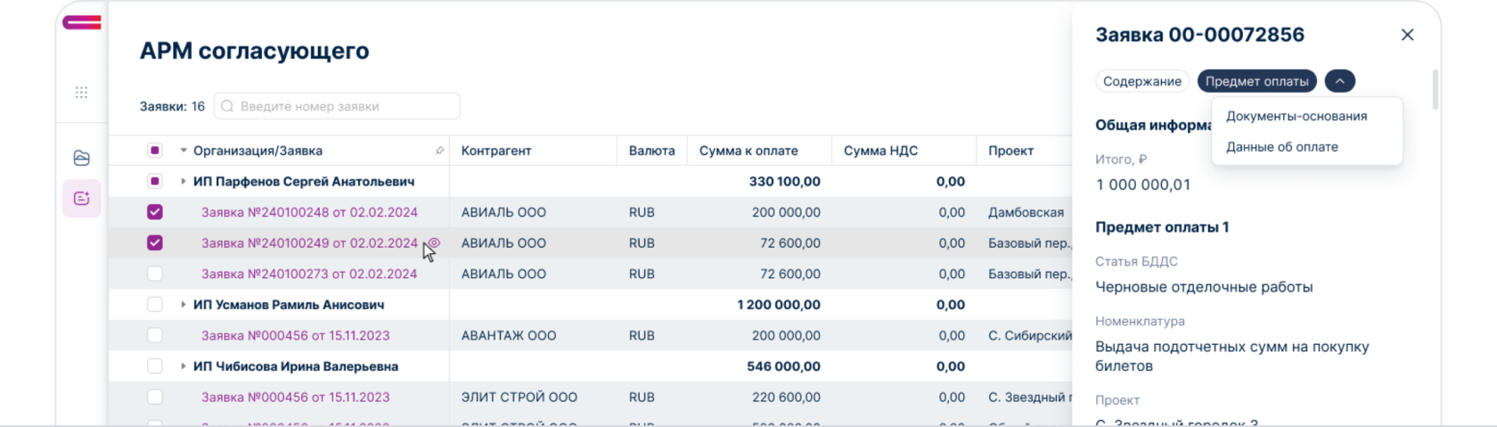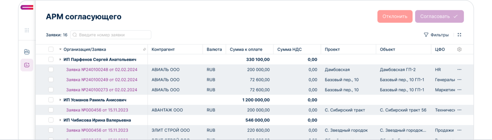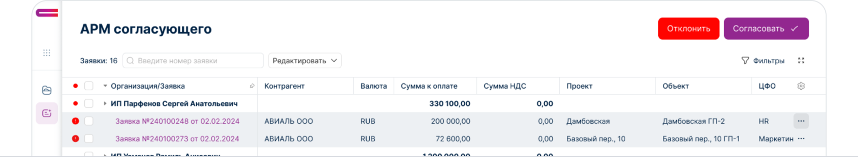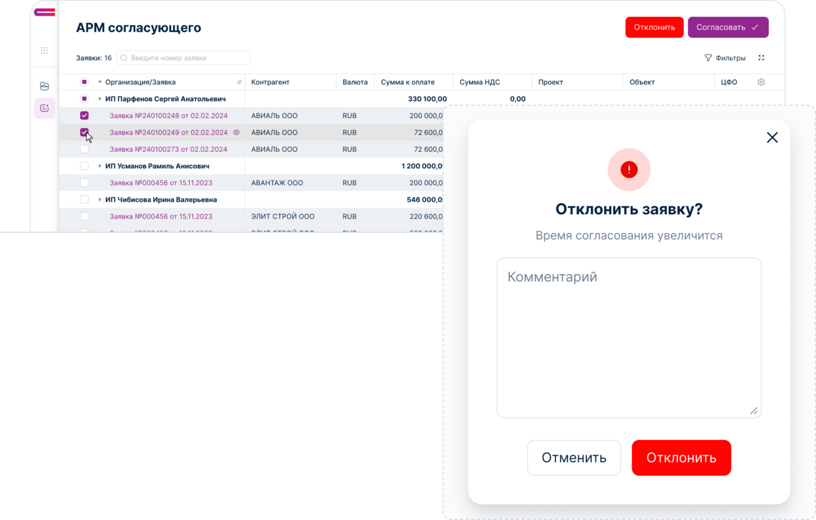 Пользователь может выбрать множество заявок и единовременно отклонить или согласовать