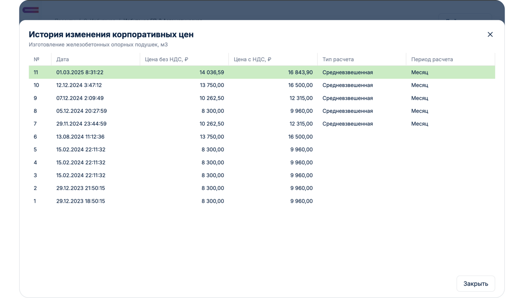 По клику на цену появится модальной окно с историей изменения корпоративных цен.