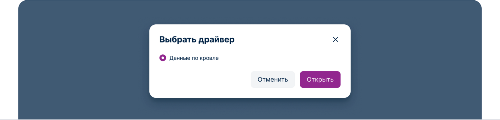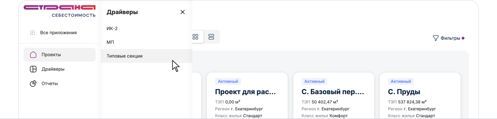 В боковом меню интерфейса системы МСС необходимо нажать на раздел «Драйверы», в сплывающем окне выбрать подраздел «Драйверы» → «Типовые секции», нажать левой клавишей мыши, появится модальное окно.