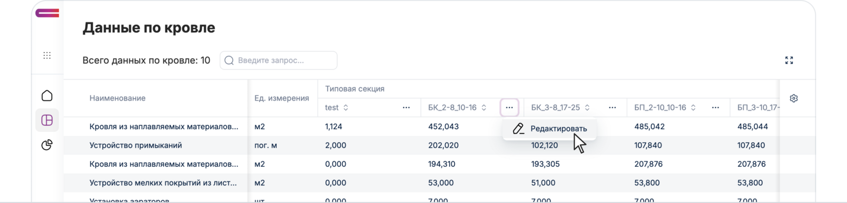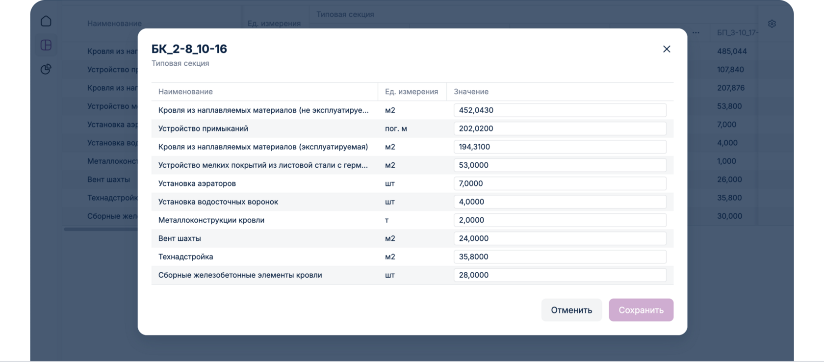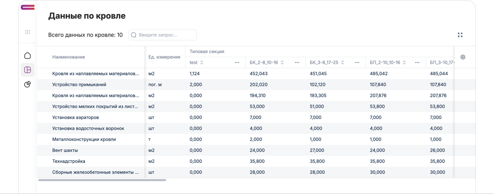 По кнопке «Открыть» пользователю становится доступна таблица с объемными показателями по кровле.
