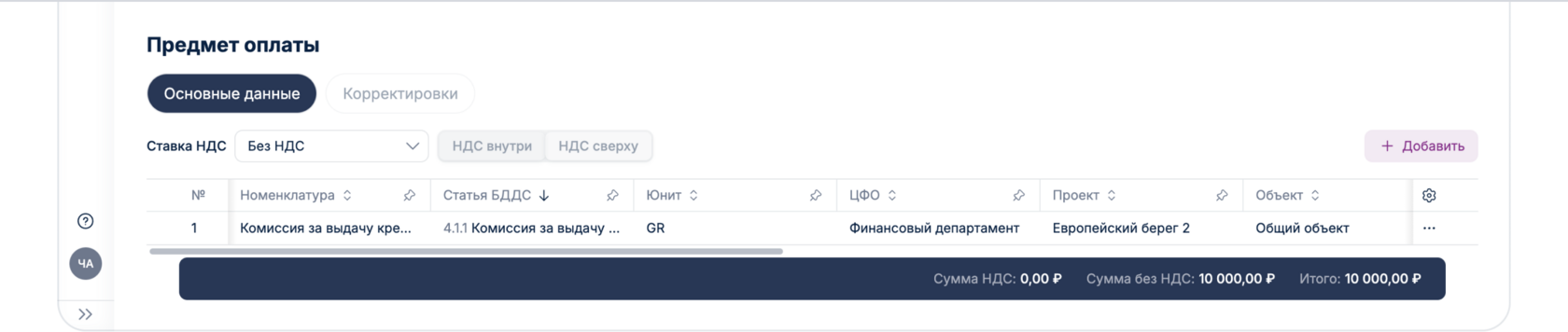 В табличной части появляется выбранная вами номенклатура или статья БДДС