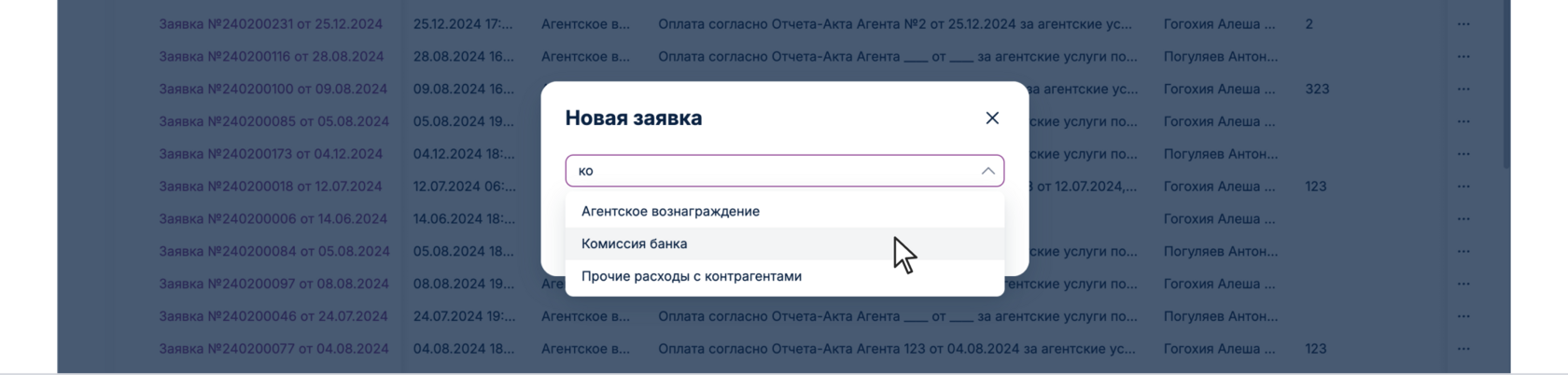В списке «Заявки» нужно нажать кнопку «Создать заявку» и выбрать вид заявки «Комиссия банка» и нажать кнопку «Создать»