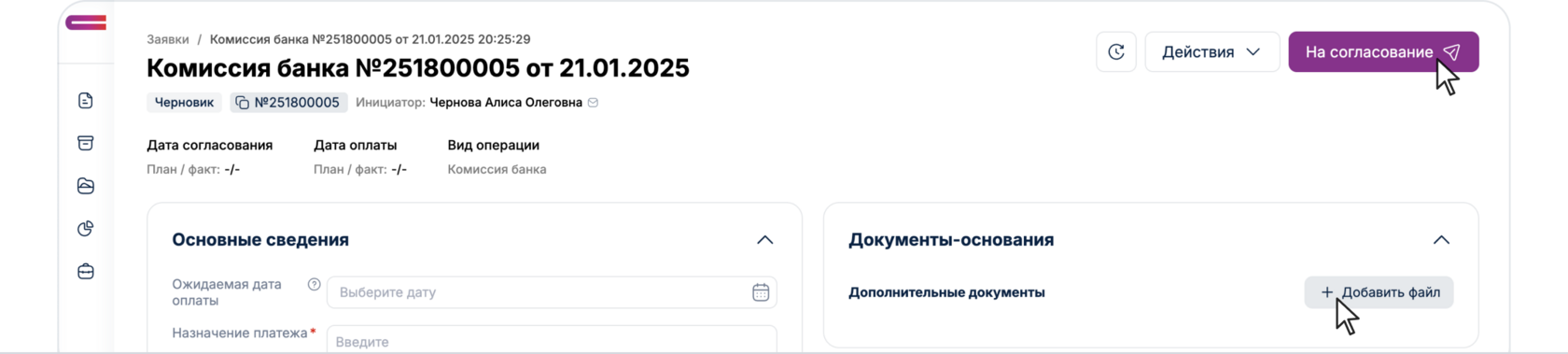Если есть какие либо документы для заявки, то их можно добавить в блок «Дополнительные документы». Это поле не обязательно для заполнения. После того как все данные заполнены заявку можно отправить на Согласование