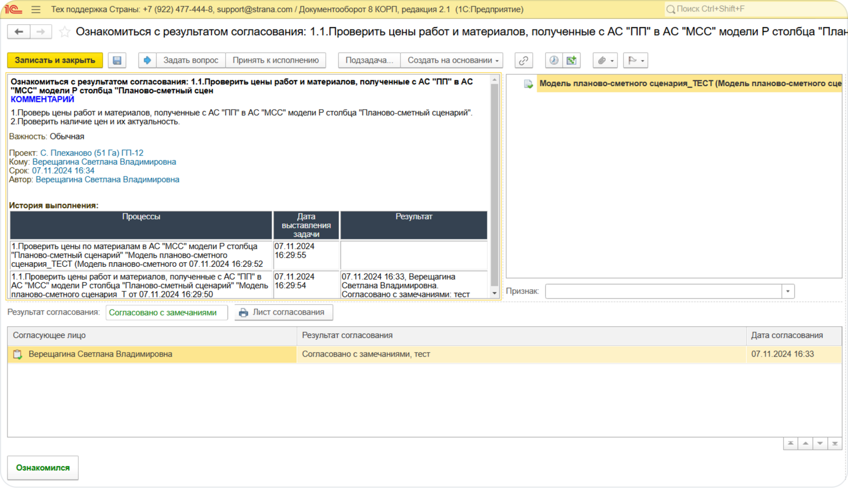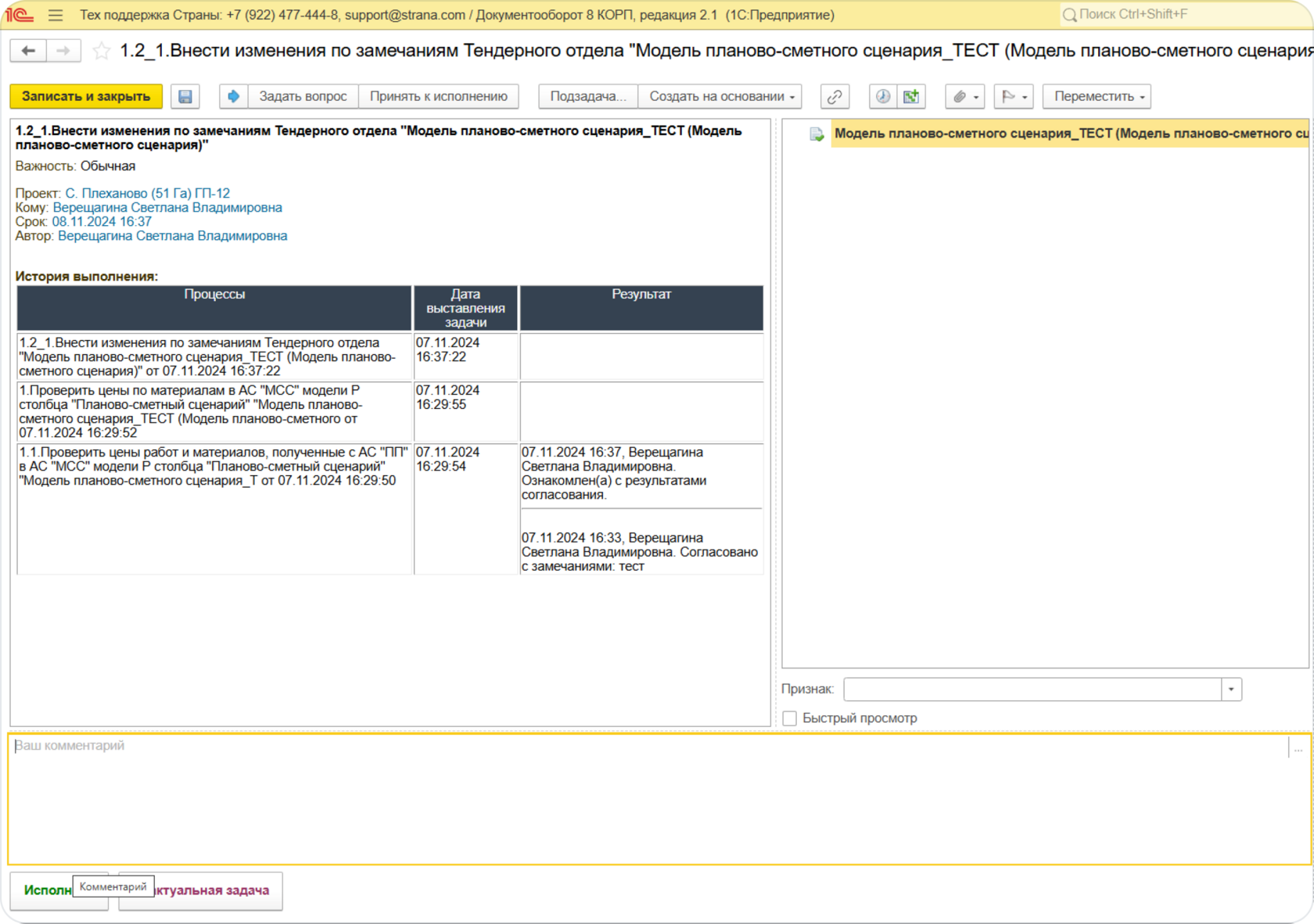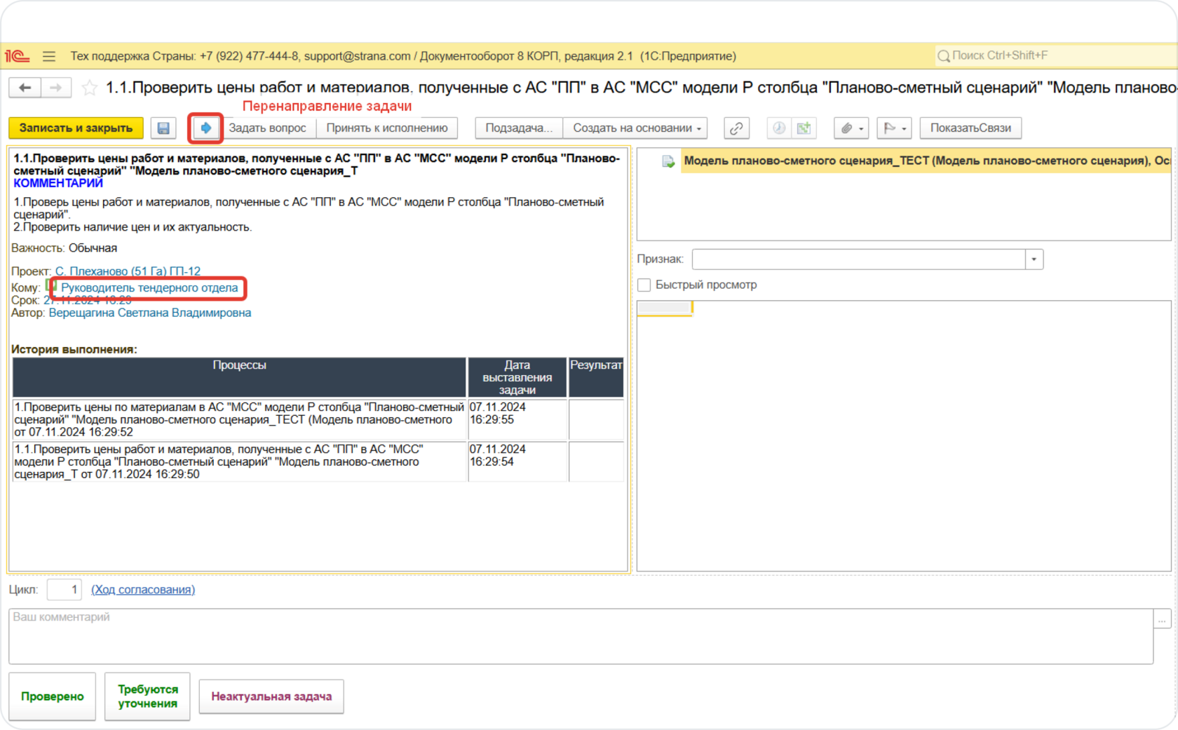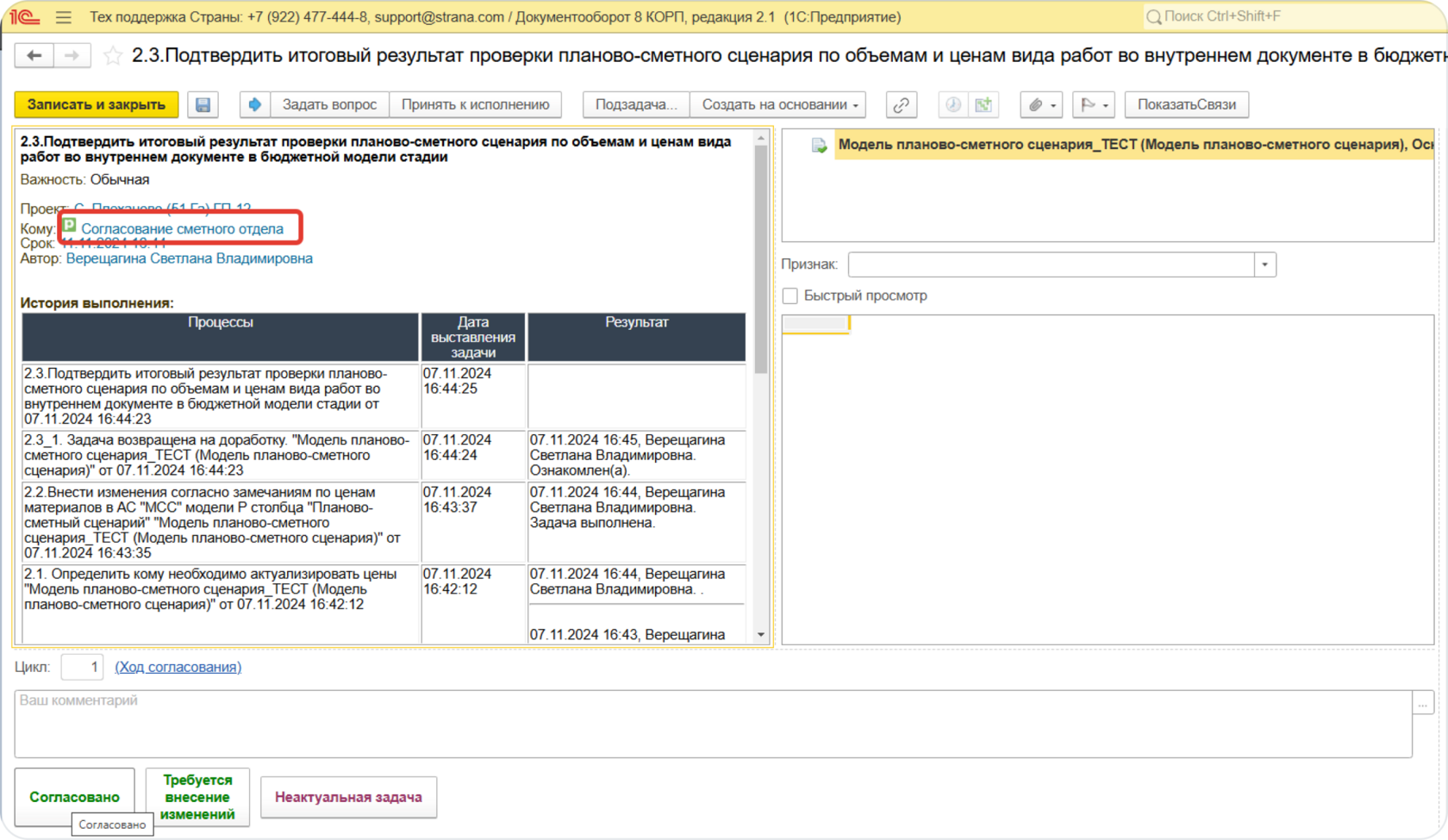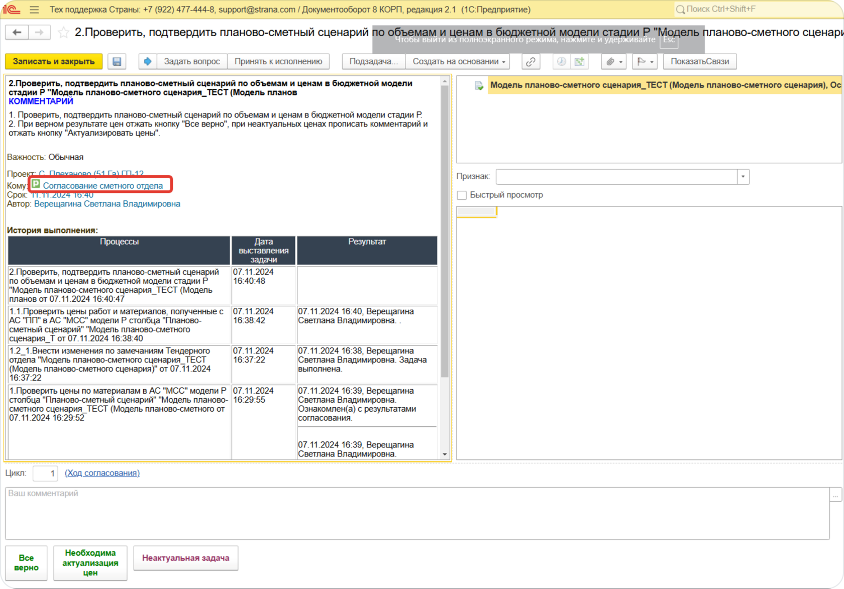 В случае необходимости отправить модель на доработку, ответственный сотрудник отжимает кнопку «Все верно» в значении «Нет», далее отжимает кнопку «Актуализировать цены», в зависимости от выбранного подразделения задача уходит на доработку в МТО и/или УТЗ
