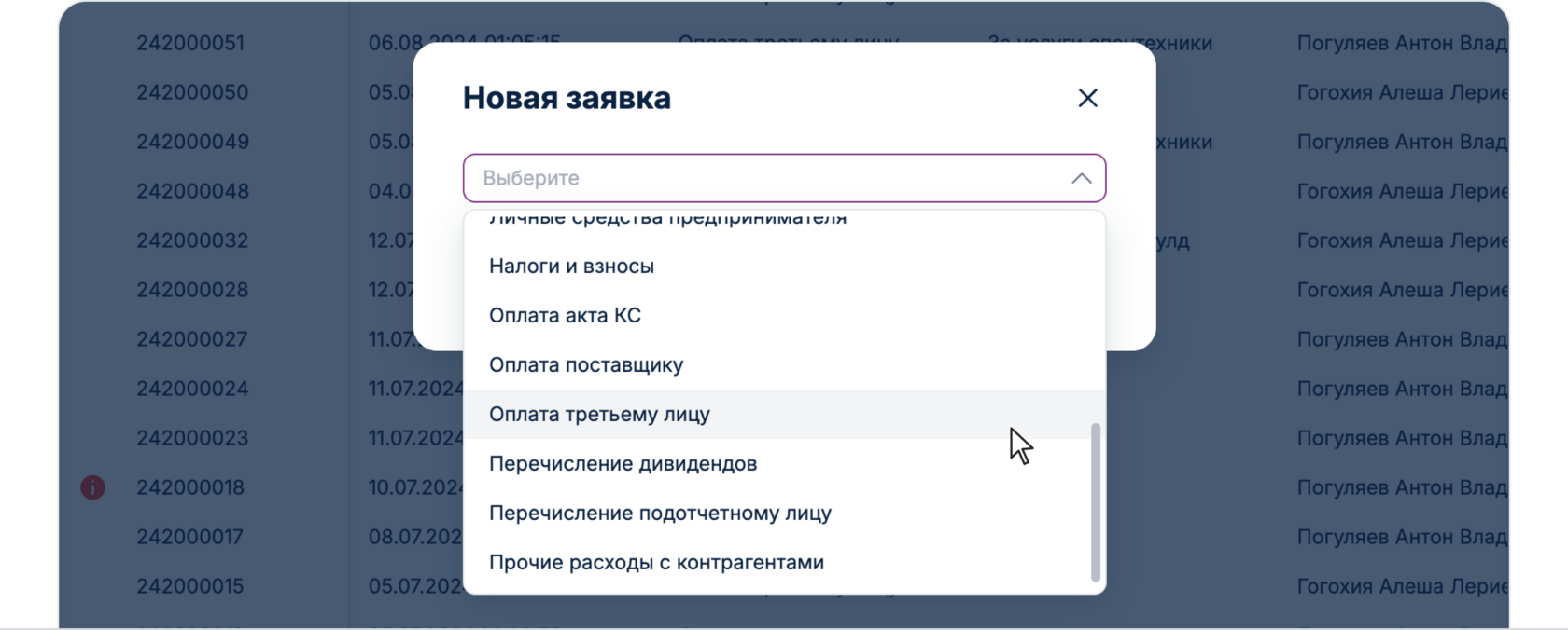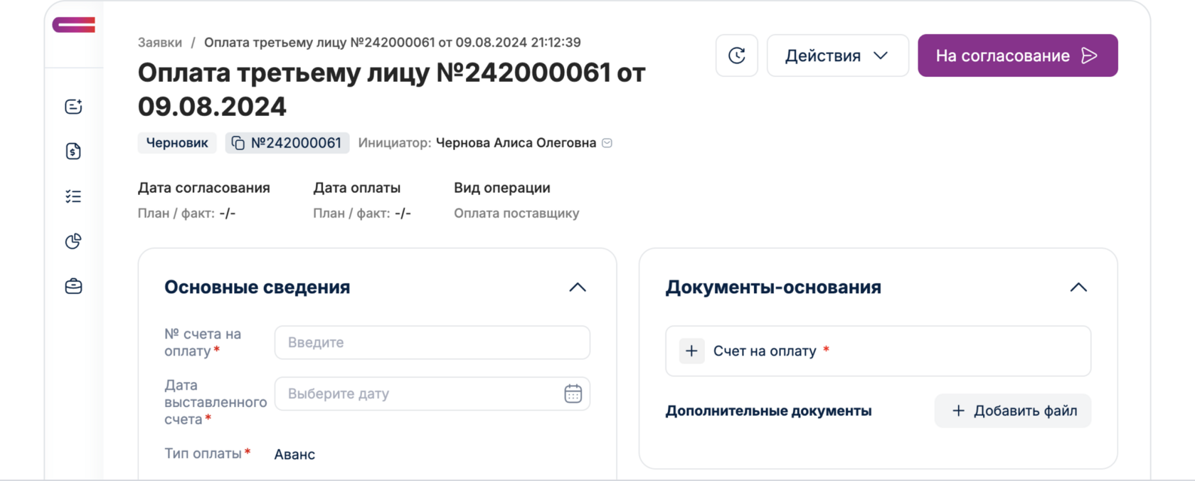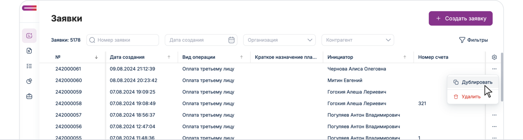 Для этого необходимо справа в списке нажать на кнопку в виде трех точек, и после этого нажать «Дублировать», высветиться окно в котором нужно нажать «Дублировать». После этого у вас создастся новая заявка, необходимо будет только до заполнить номер и дату счета, добавить номенклатуру и добавить файл счета.