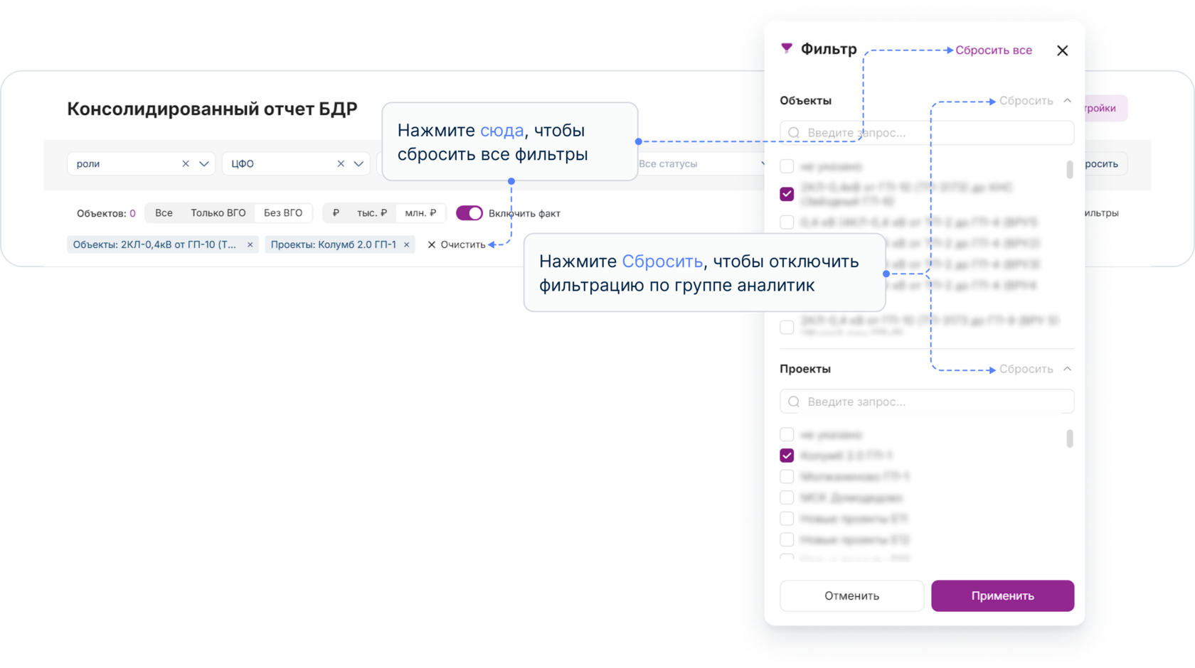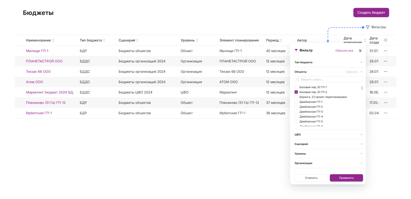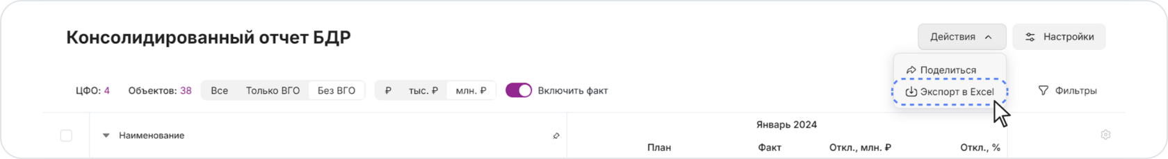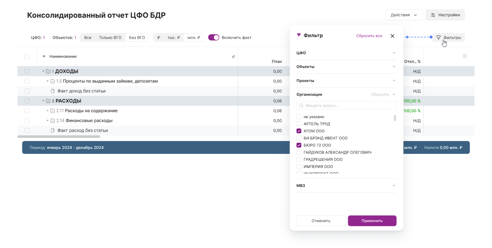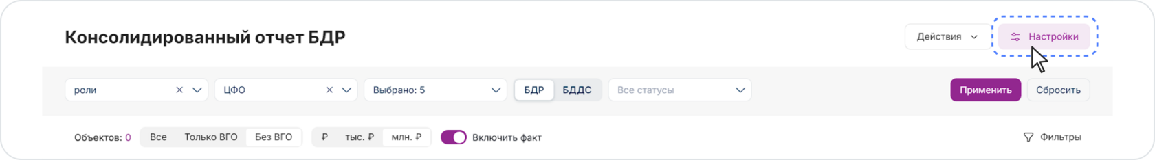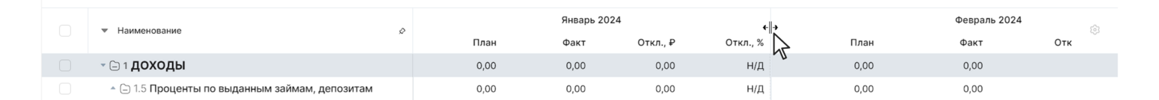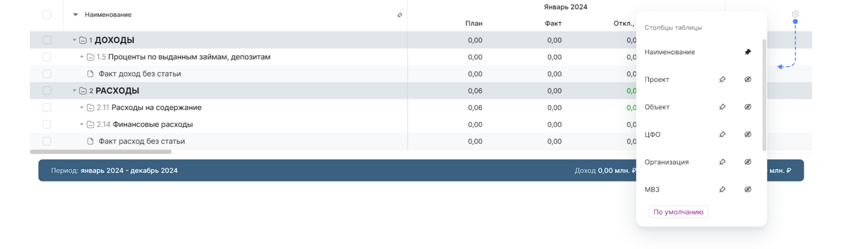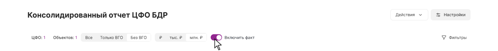 Для отключения колонок с фактическими данными бюджета необходимо нажать на переключатель Включить факт