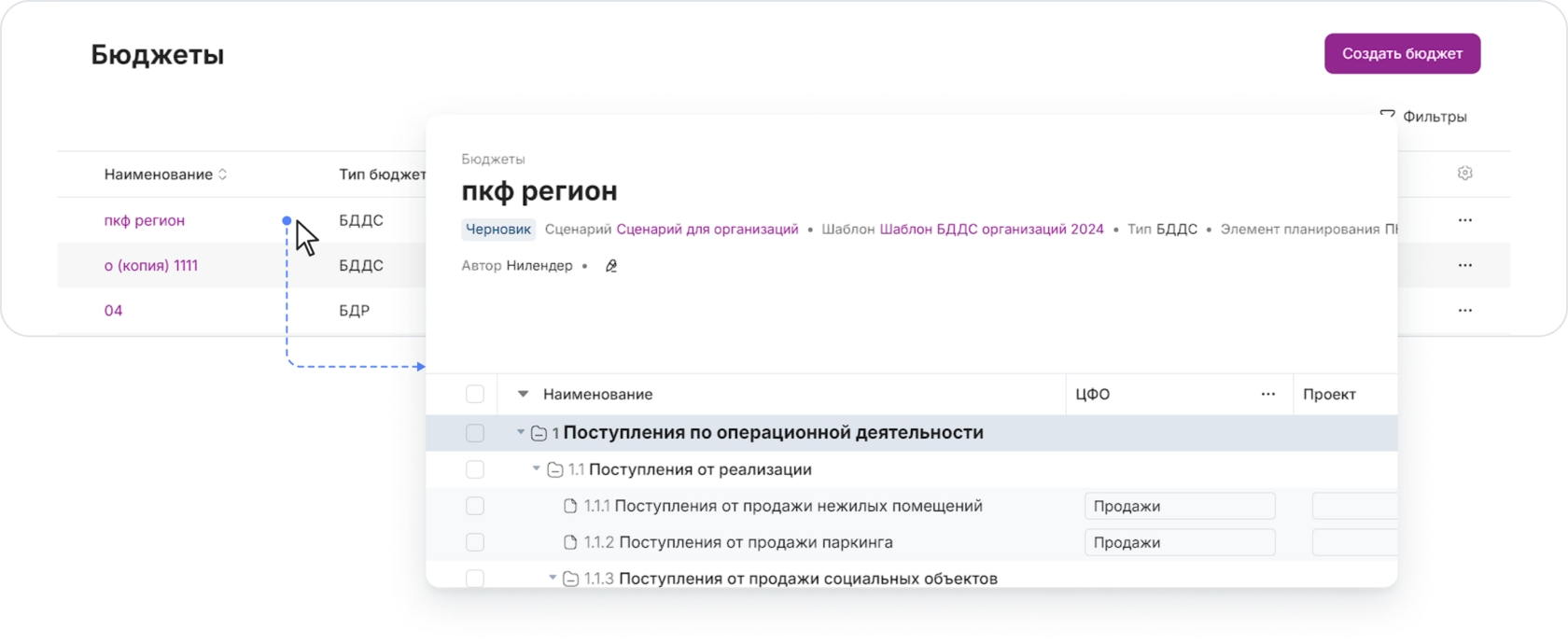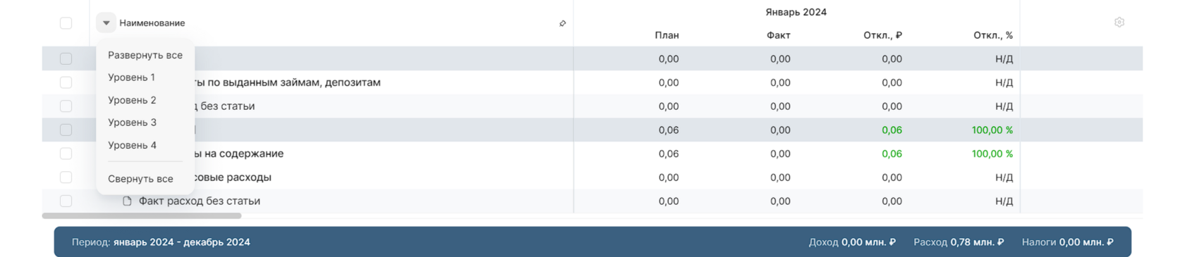 Для просмотра статей бюджета ниже по иерархии можно использовать панель раскрытия всех статей бюджета или воспользоваться элементом раскрытия только одной группы (стрелочка слева от названия статьи)