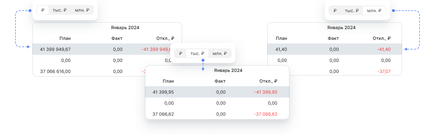 Для отображения суммарных значений в разрезе рубли, тысячи, миллионы над таблицей расположен деноминатор