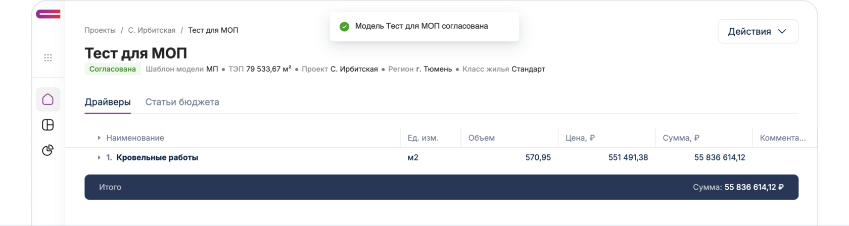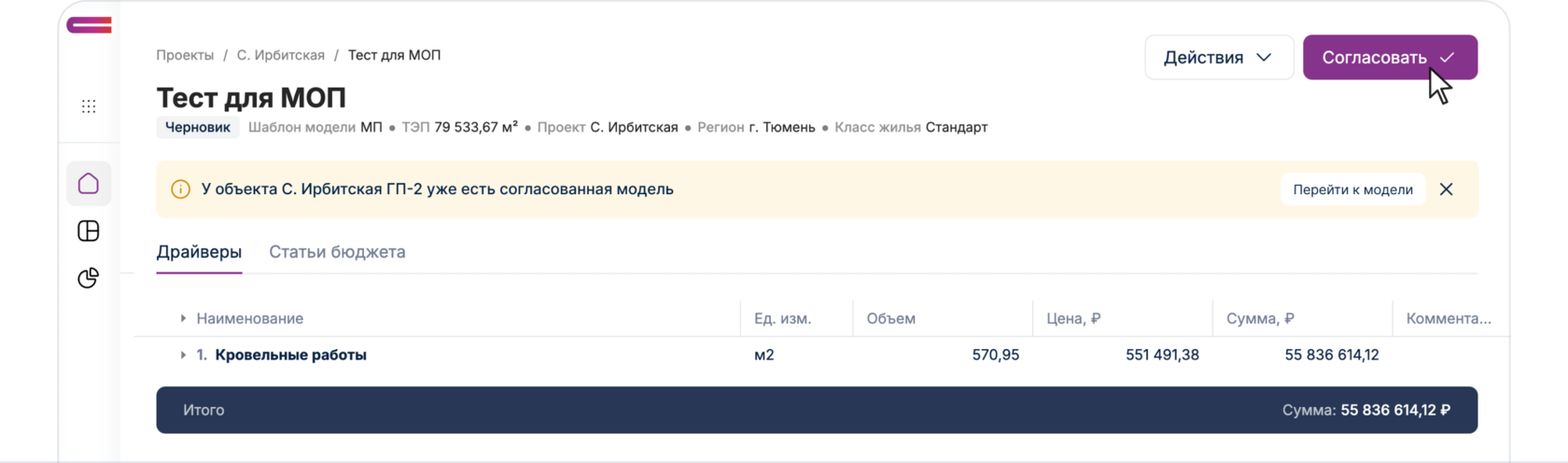 После сохранения модели в Черновик появляется возможность согласовать модель.