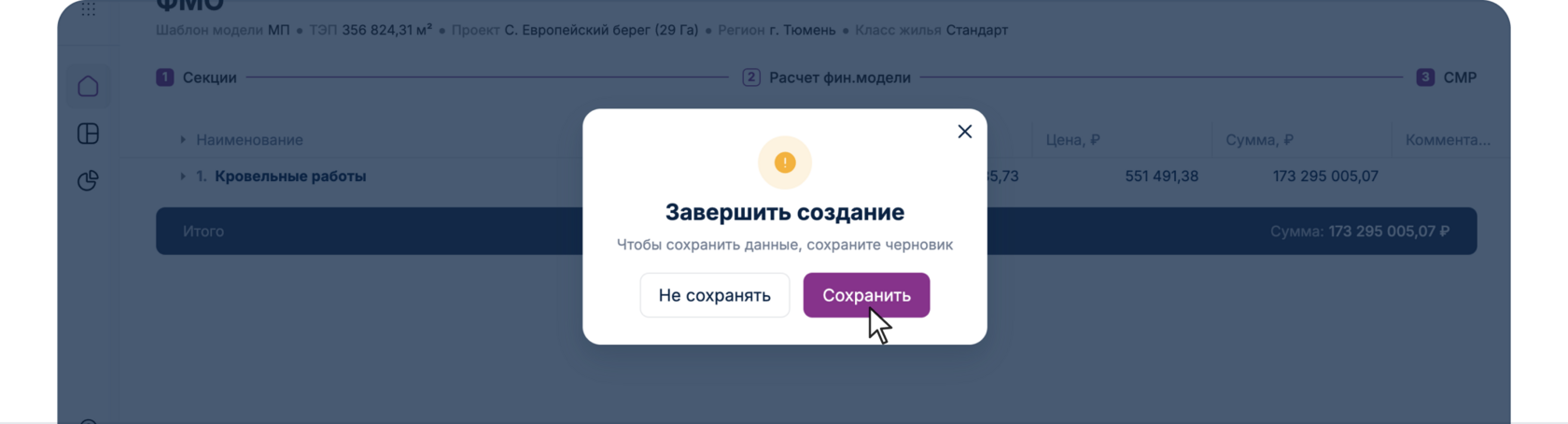 При нажатии на кнопку появляется модальное окно с возможностью закрыть модель без сохранения, либо сохранить модель в черновик.
