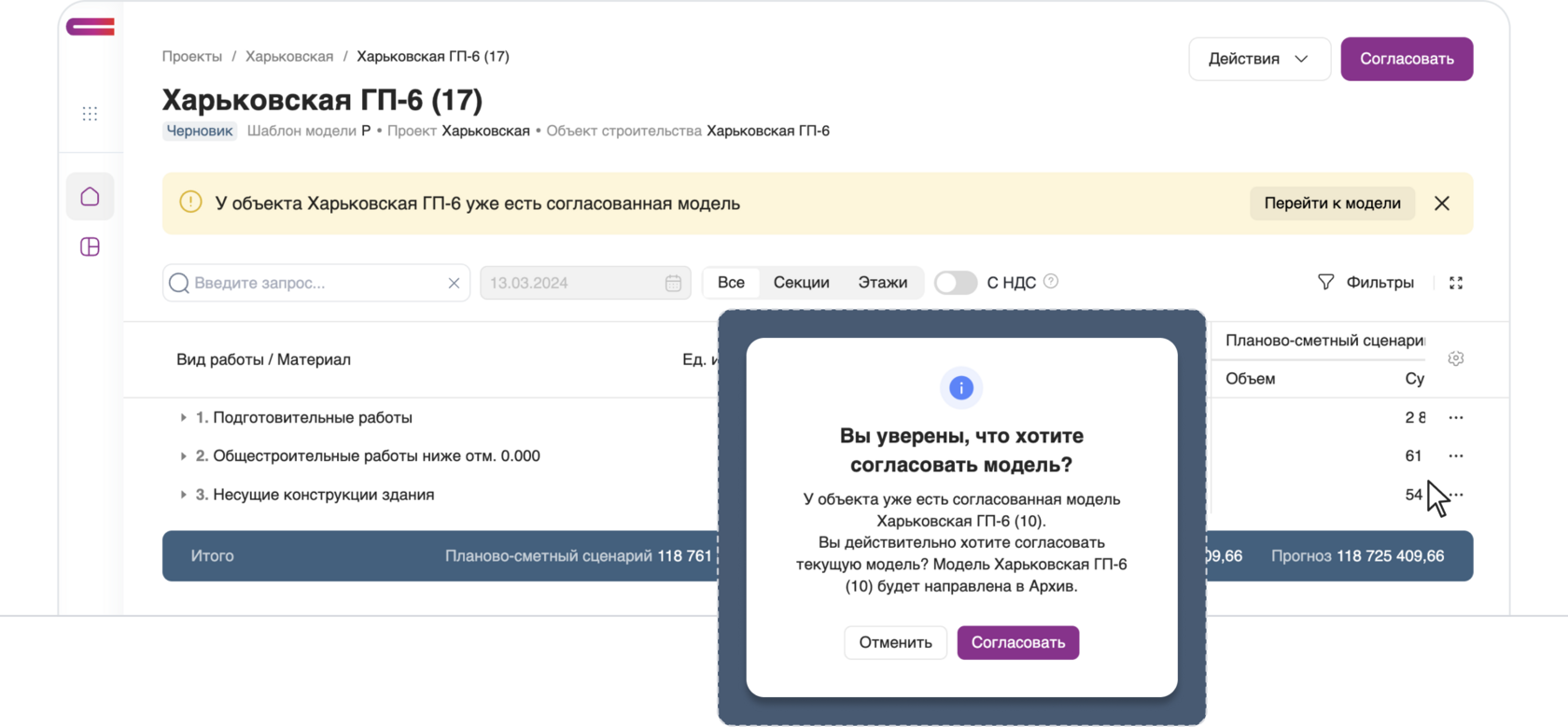 По кнопке «Перейти к модели» можно просмотреть ранее согласованную модель.