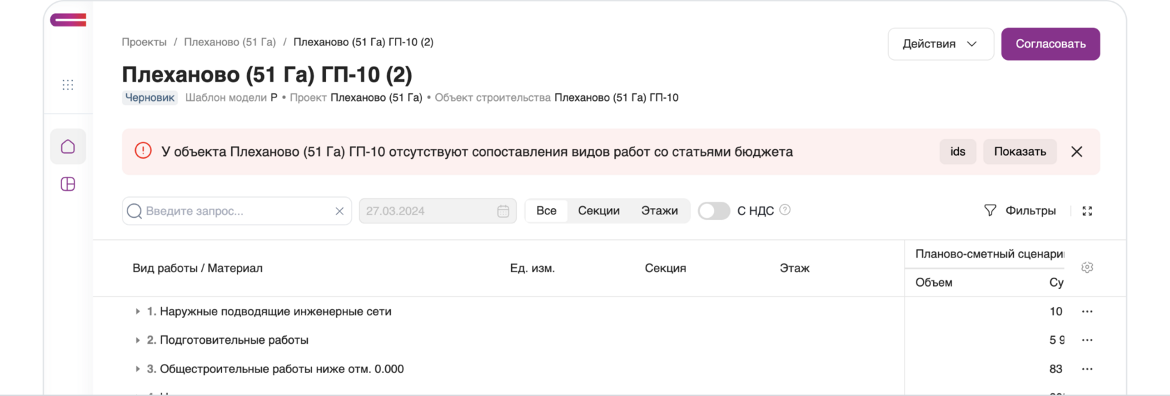 Если у вида работ отсутствует сопоставление вида работ со статьей бюджета, то на форме модели появляется информационное сообщение.