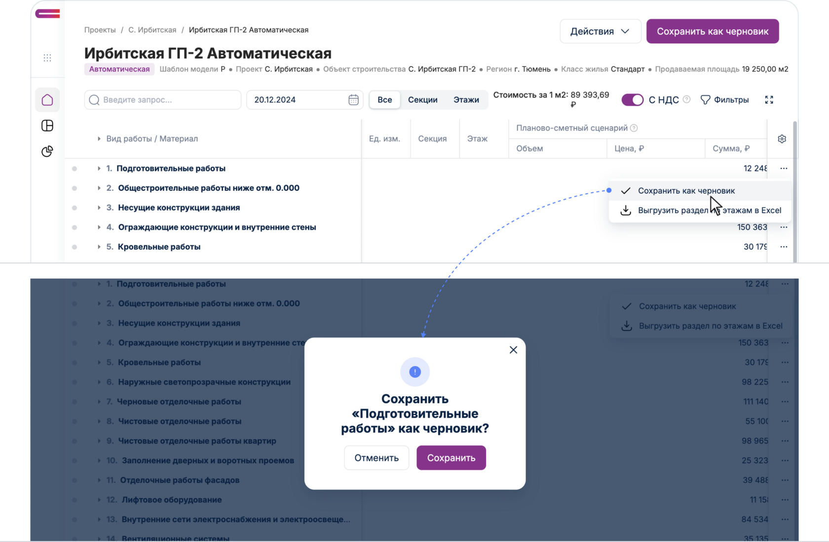 Для частичного сохранения одного раздела в Черновик нужно нажать на ••• справа от выбранного раздела и выбрать функцию «Сохранить как черновик». В данном случае в Черновик будет переведена модель с одним разделом.