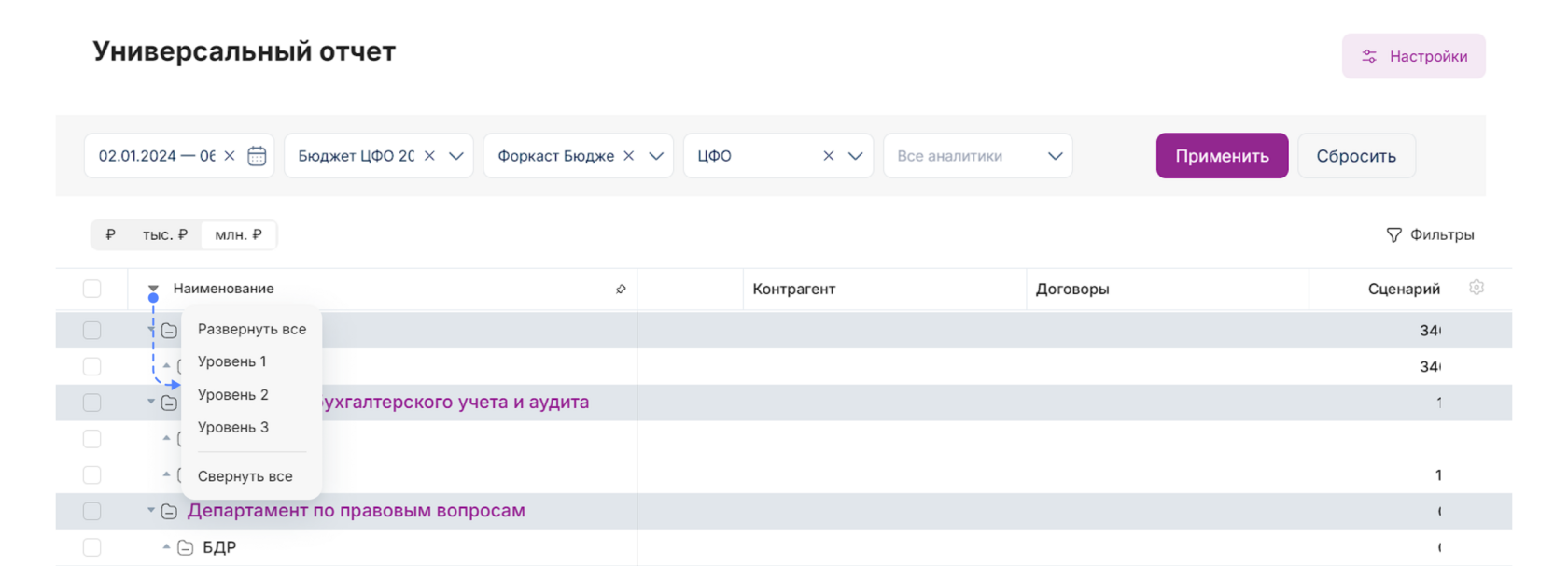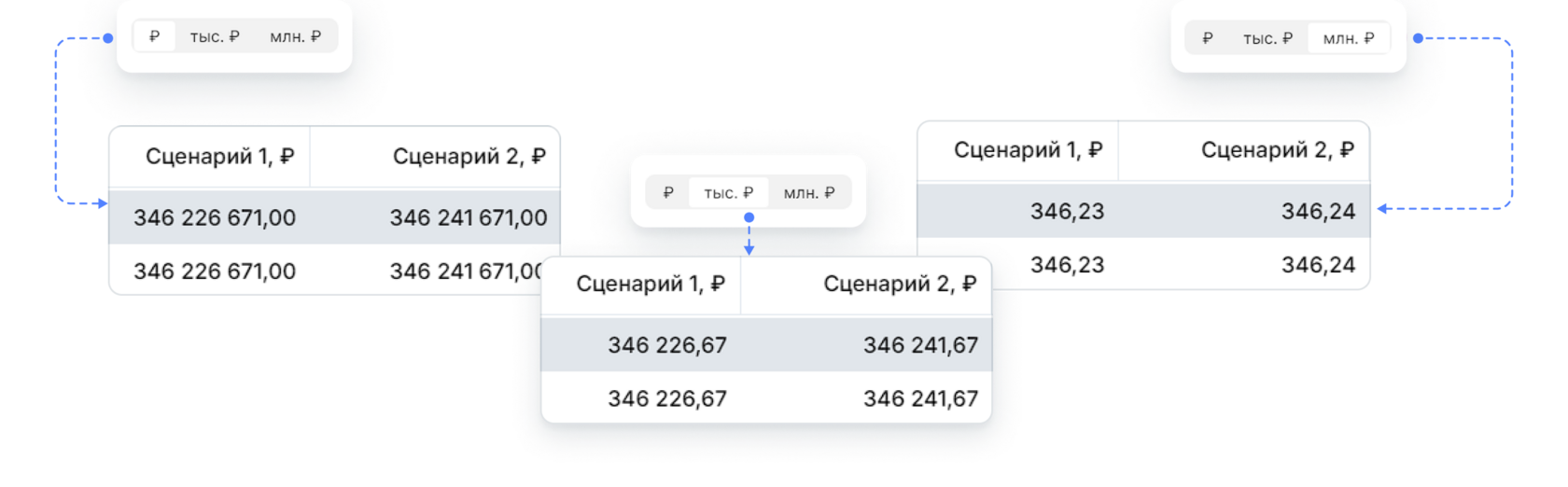 Используйте деноминатор, расположенный над таблицей, чтобы изменять отображение суммарных значений в разрезе рубли, тысячи, миллионы