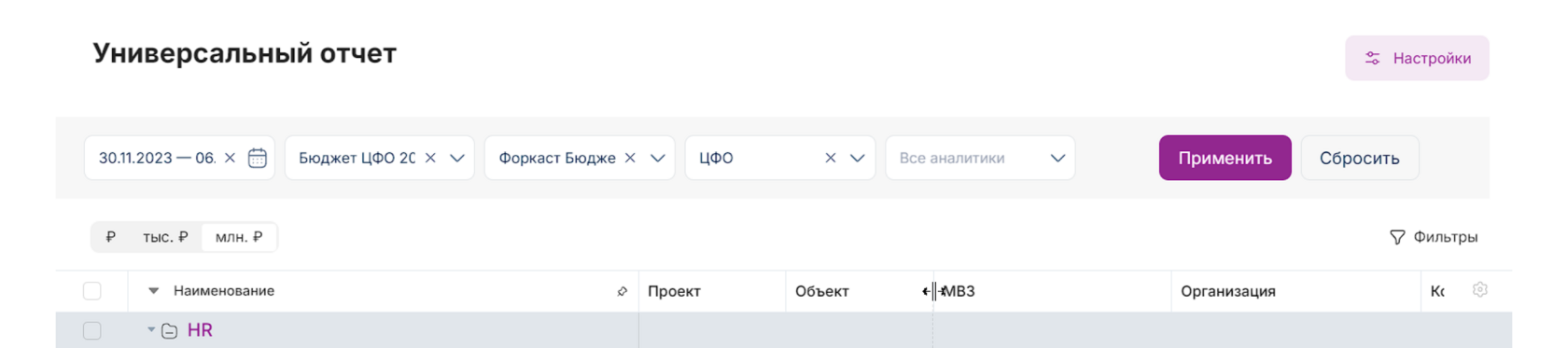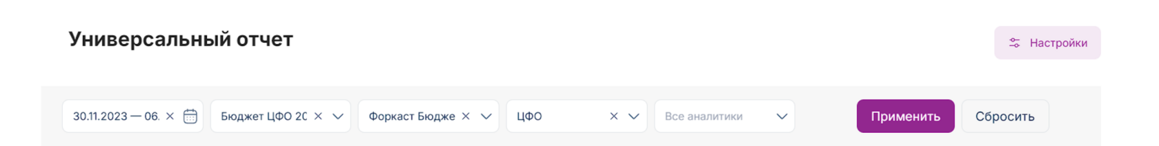 Фильтрация отчета доступна по аналитикам, выбранным для отображения при построении отчета