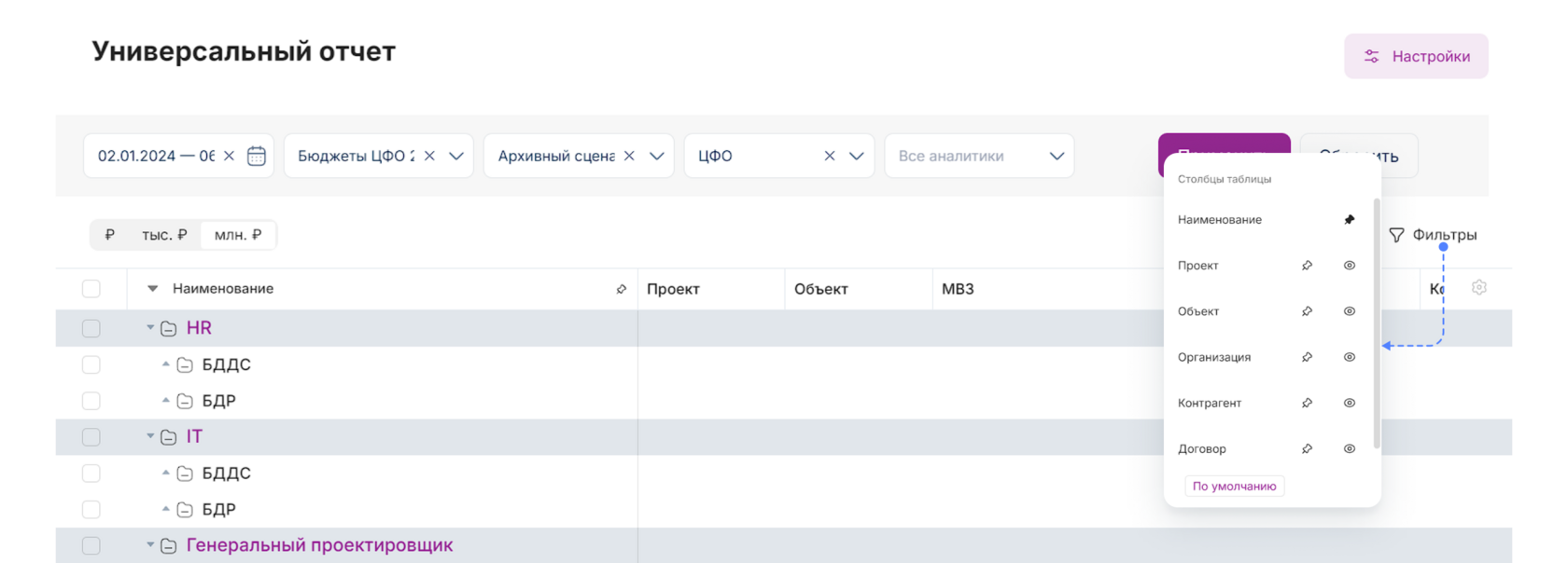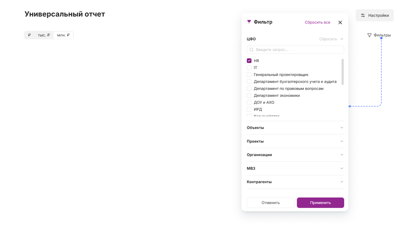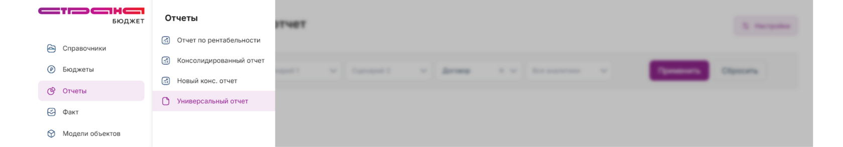 Справа откроется дополнительная панель меню, нажмите Универсальный отчет