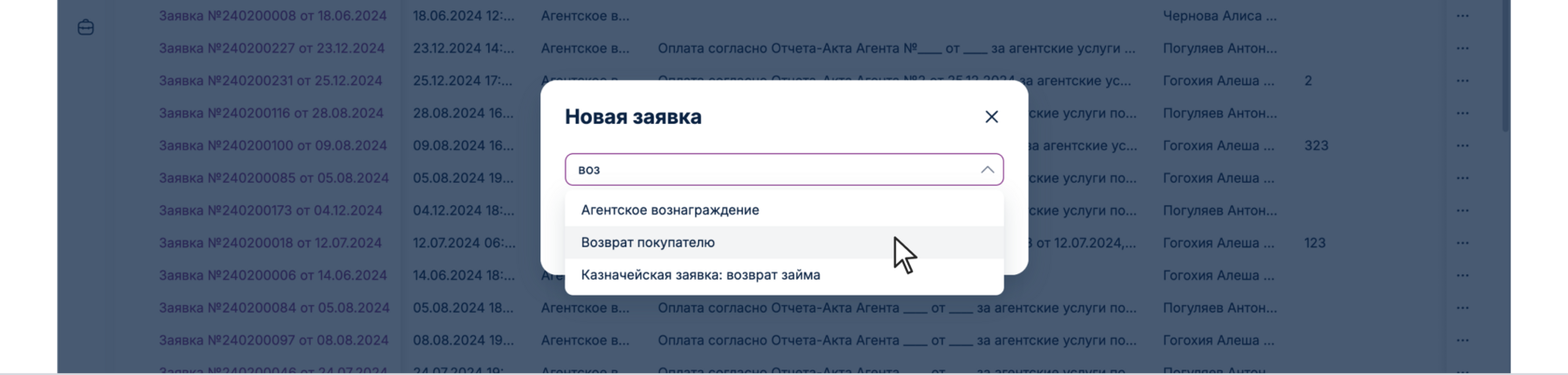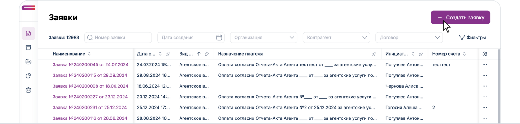 В списке «Заявки» нужно нажать кнопку «Создать заявку» и выбрать необходимый вид заявки