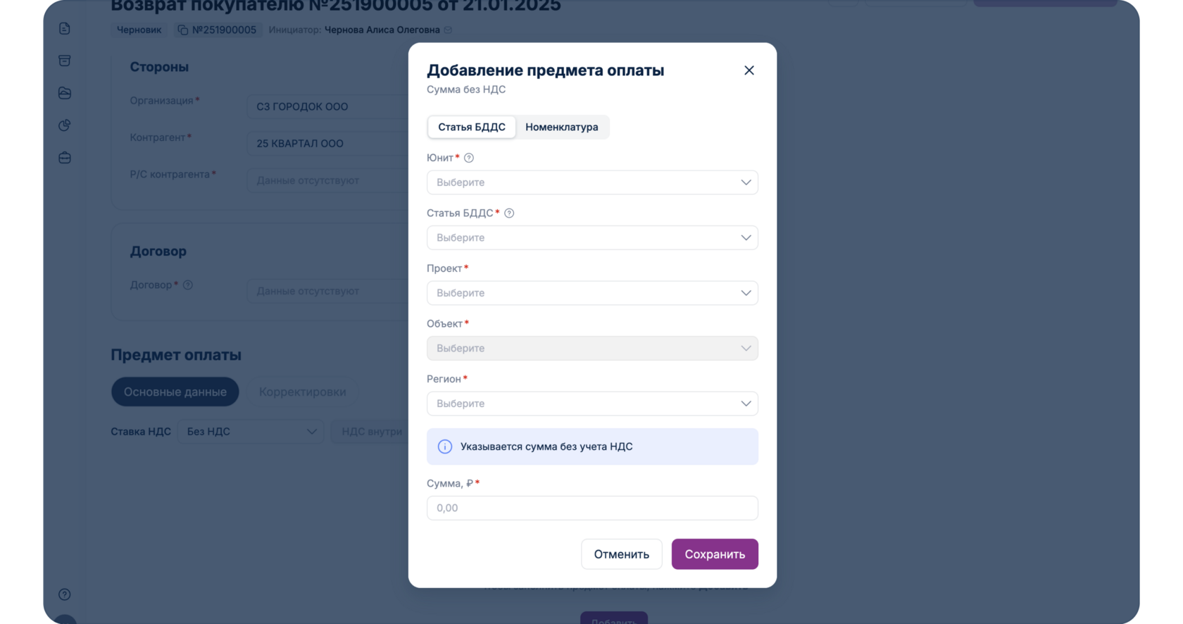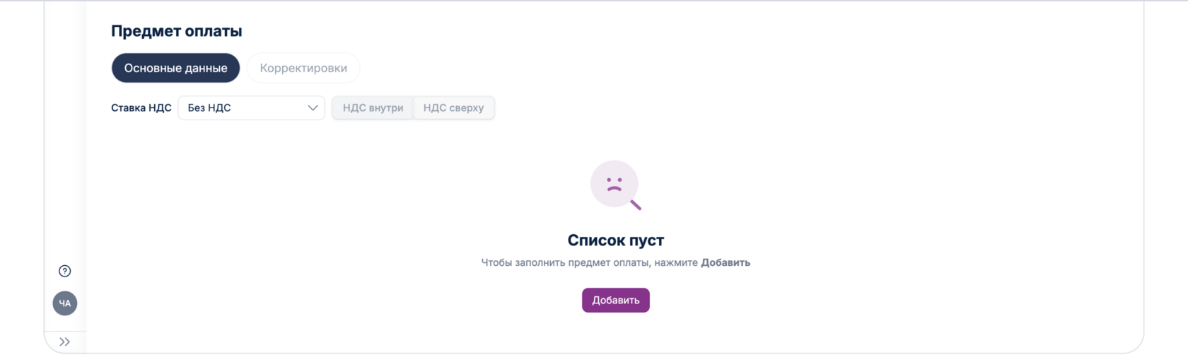 После того как заполнены все обязательные поля. Нужно заполнить предмет оплаты, для этого нужно нажать кнопку «Добавить». После этого откроется модальное окно в котором необходимо заполнить весь атрибутивный состав.