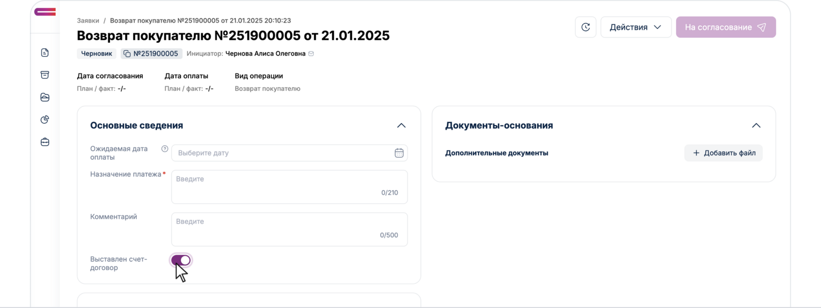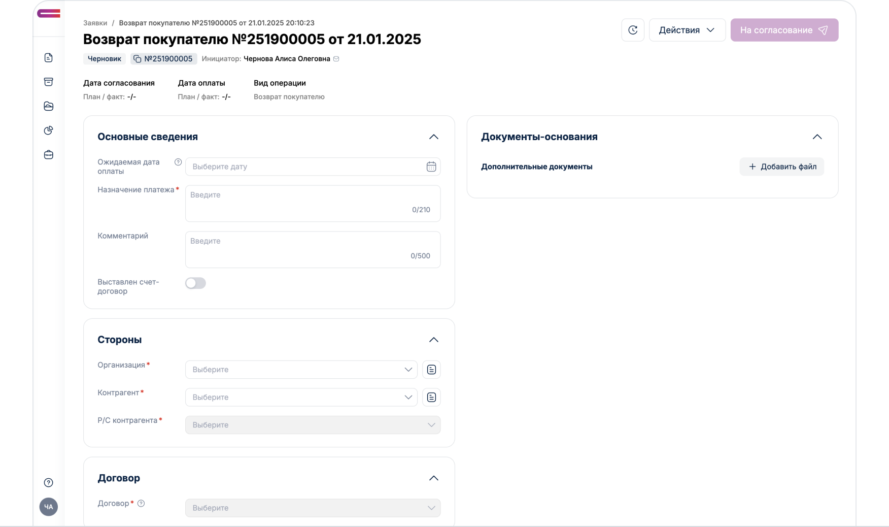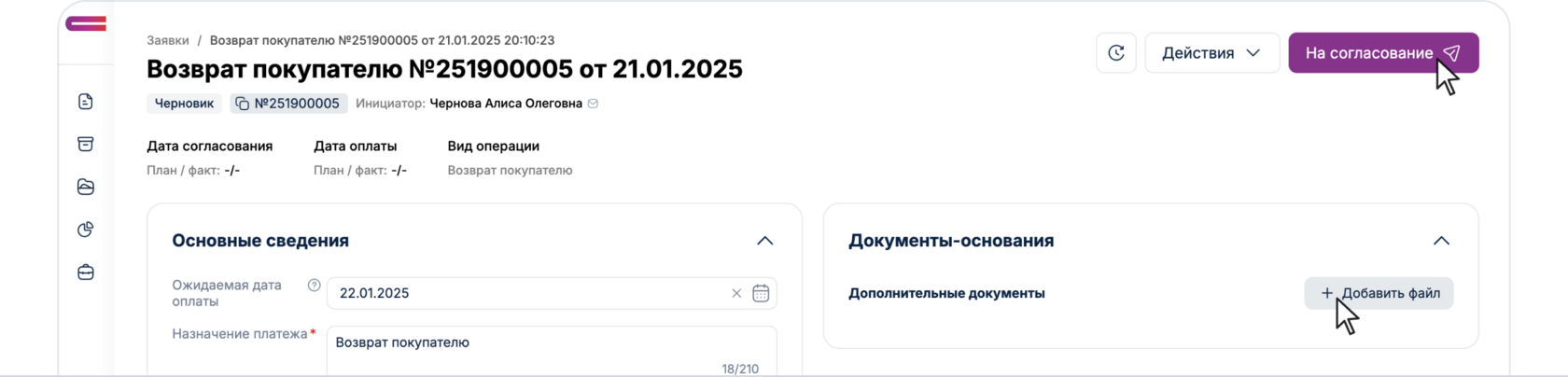 Если есть какие либо документы для заявки, то их можно добавить в блок «Дополнительные документы». Это поле не обязательно для заполнения. После того как все данные заполнены заявку можно отправить на Согласование.