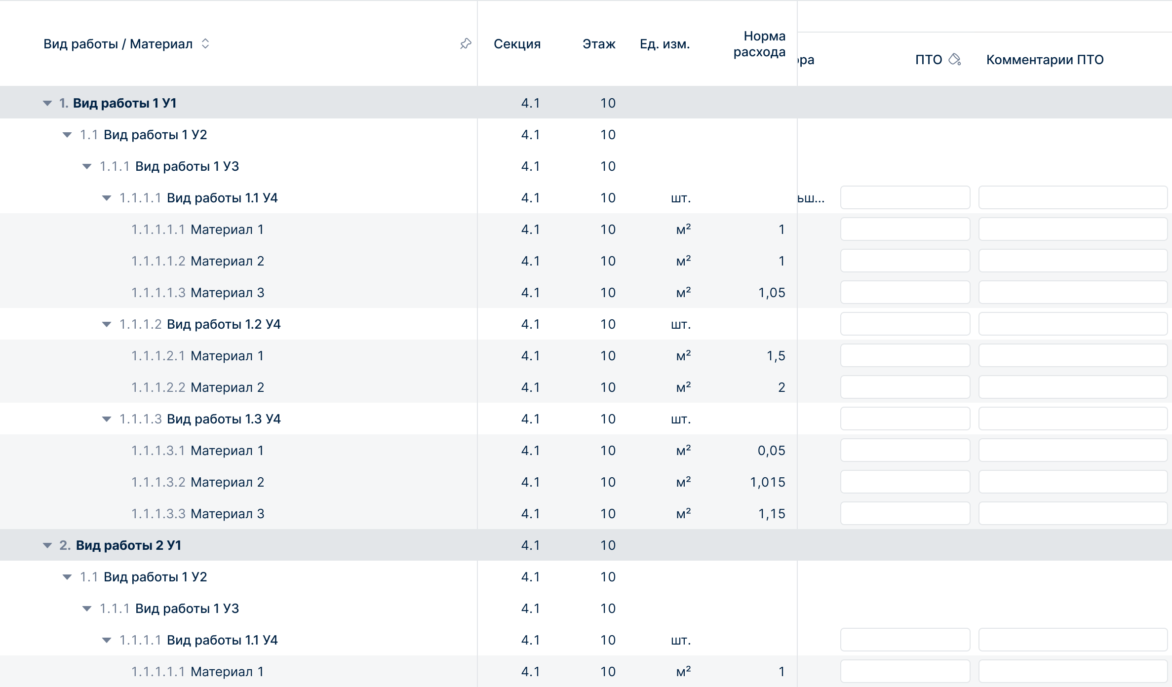 Для заполнения объемов вам необходимо подтвердить объемы по видам работ и материалам в столбце «ПТО», либо внести часть объемов, к которым имеются замечания. Также есть возможность оставить комментарий для каждой позиции вида работ и материала.