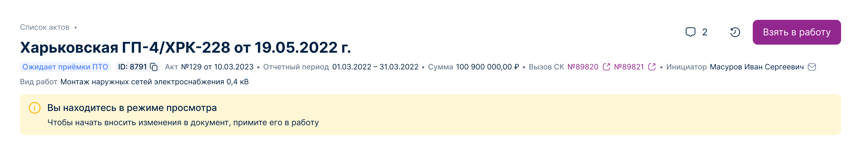 Когда вы открываете страницу акта, он доступен только к просмотру. Для того, чтобы вы могли начать работать с актом, вам нужно нажать на кнопку Взять в работу