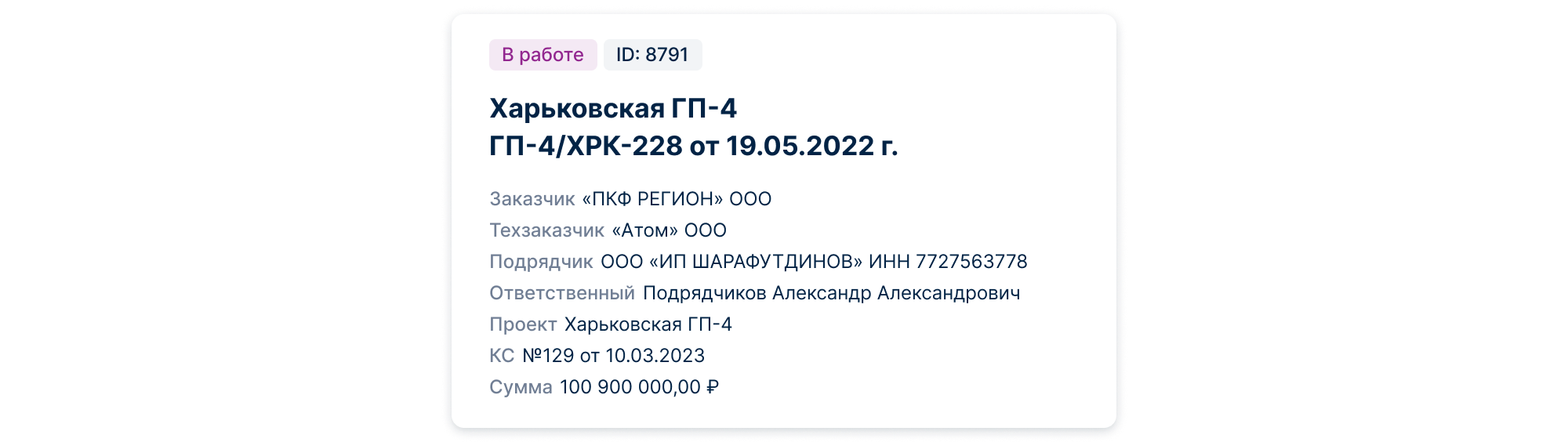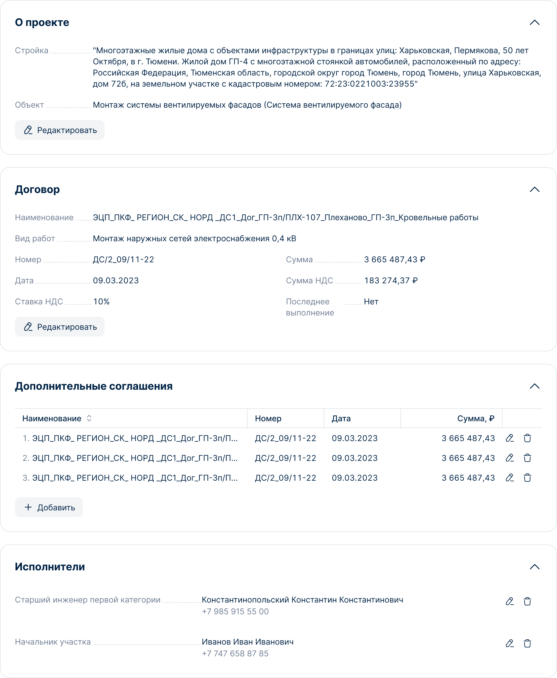 Раздел разбит на несколько блоков: Заказчик, Подрядчик, О проекте, Договор, Дополнительные соглашения, Исполнители