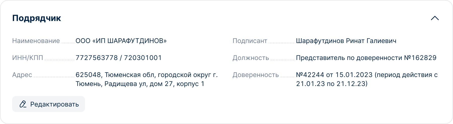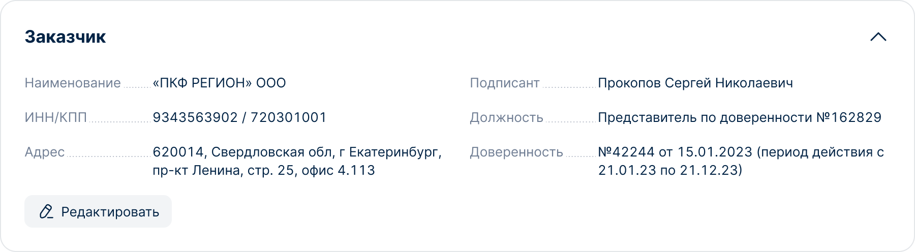 В этом блоке находится общая информация по акту, которую сотруднику ПТО необходимо проверить и дополнительно внести свои данные по доверенности и должности. Блок содержит следующую информацию о заказчике: