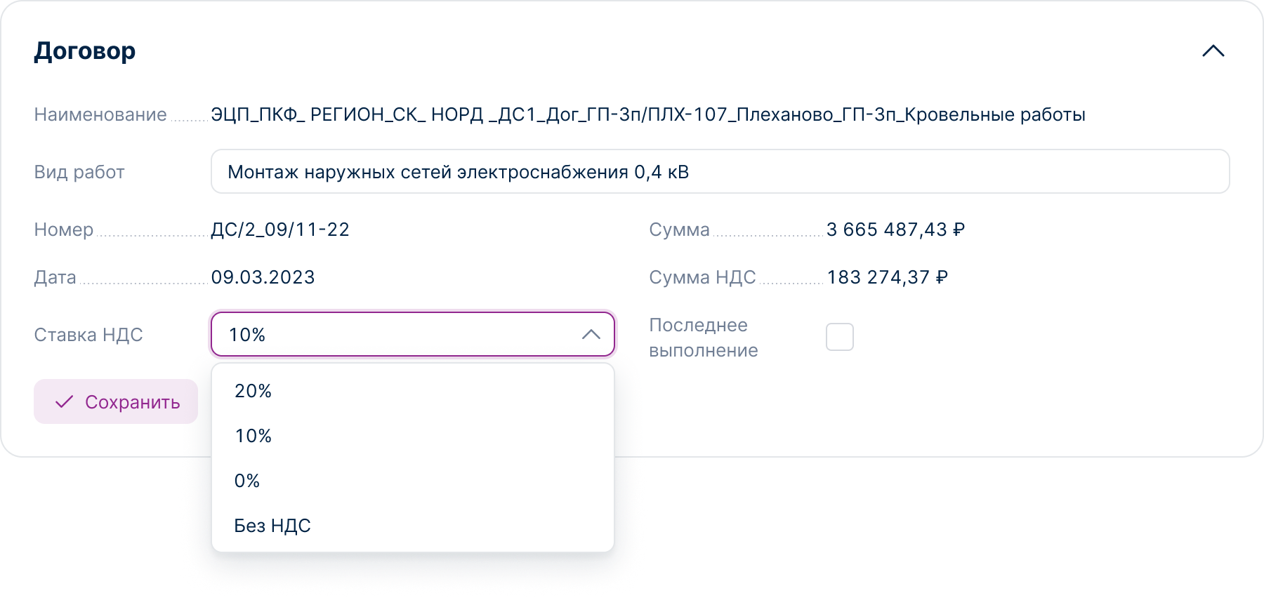 Также в разделе Договор есть возможность изменить ставку НДС, если она была внесена неправильно.