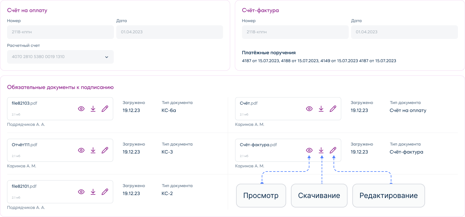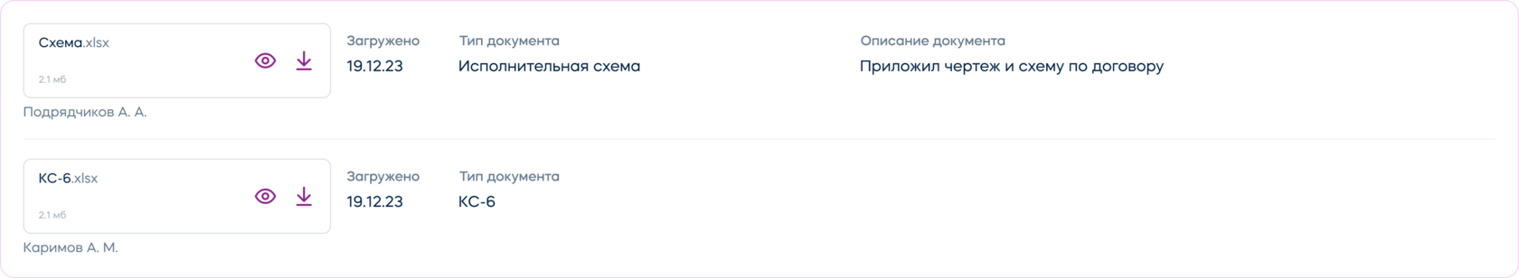 В данном блоке подрядчик подгружает обязательный документ КС-6 (временное решение, далее будет автоматическое формирование КС-6), а также исполнительную документацию по своему фронту работ. Сотрудник ПТО обязан проверить наличие исполнительной документации по принятым работам и форму КС-6 на оформление и объёмы. Ознакомиться с исполнительной документацией можно через значок просмотра