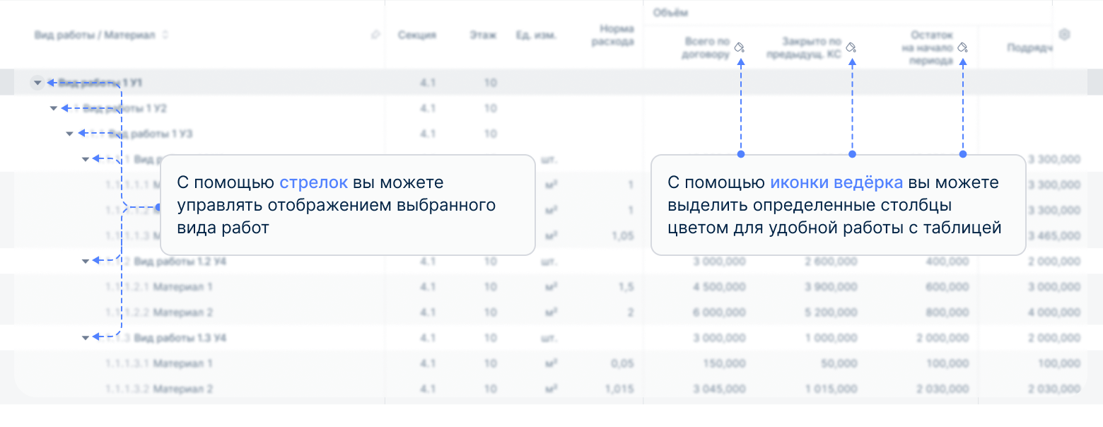Иконка Переместить (шесть точек перед названием столбца) — позволяет перетаскивать столбцы, меняя их очередность в рамках определенного вида работ