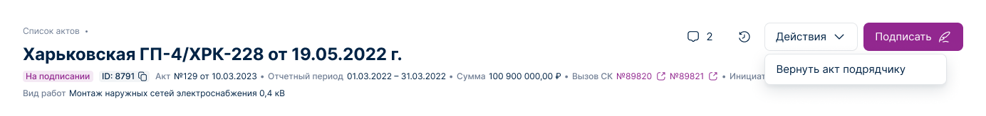 На данном этапе есть возможность вернуть акт на доработку через кнопку Действия — Вернуть акт подрядчику.