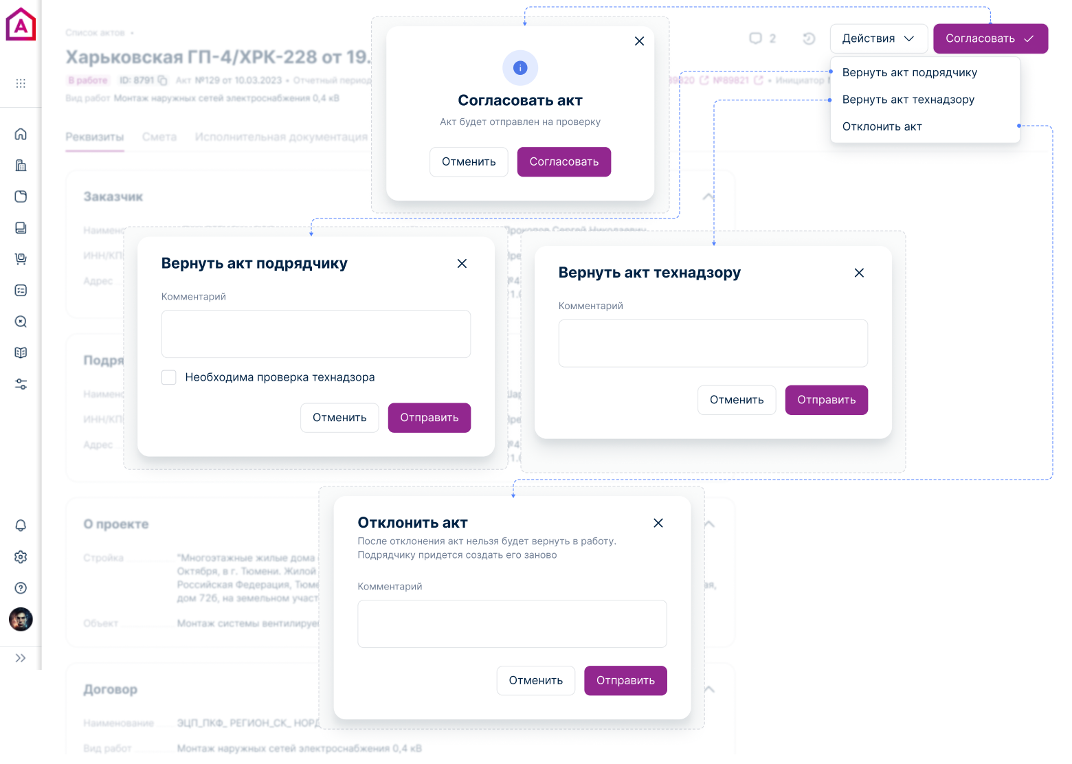 Действие Вернуть акт технадзору позволяет вернуть акт на доработку сотруднику технадзора