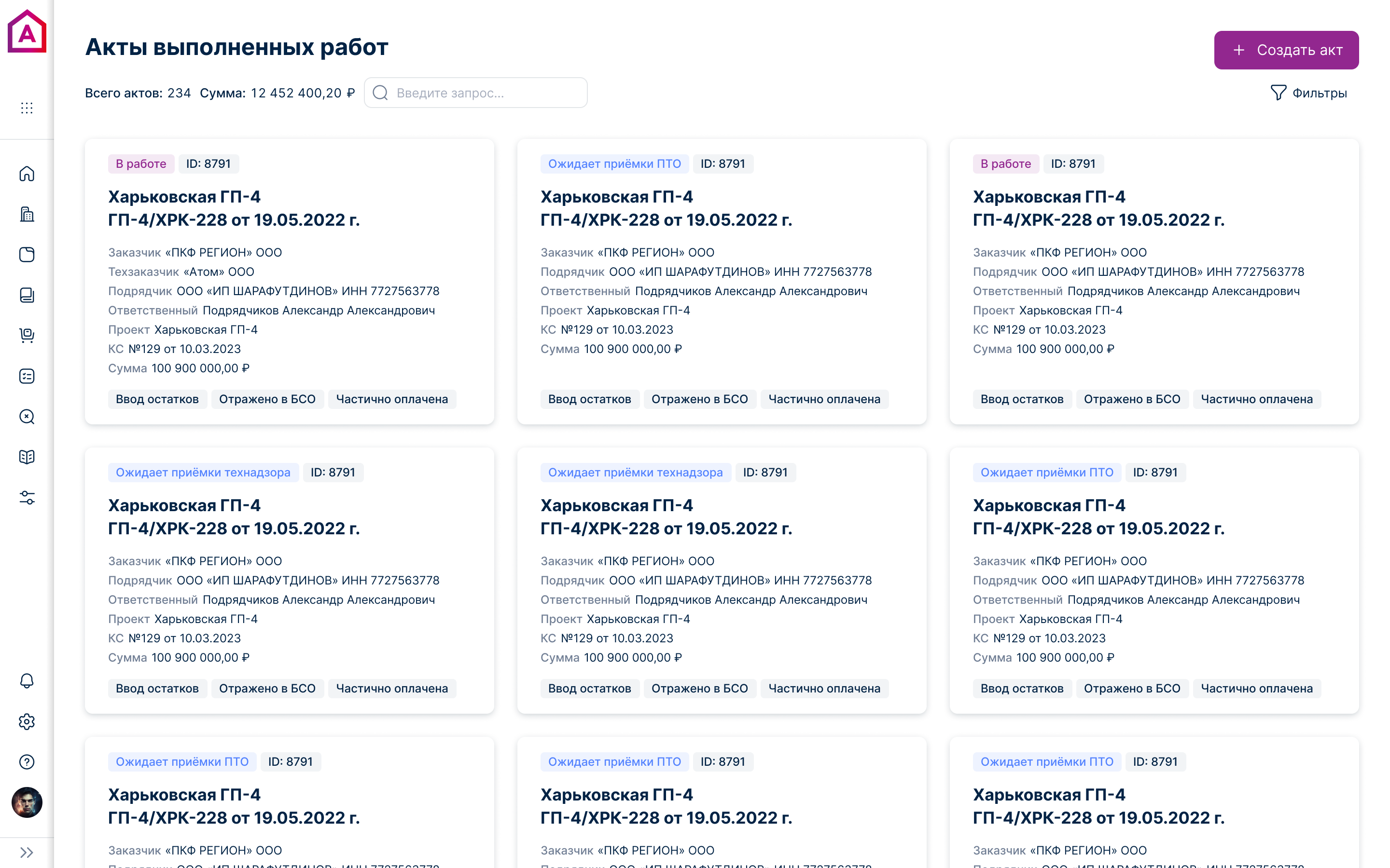 После авторизации вы попадаете на страницу со списком актов выполненных работ