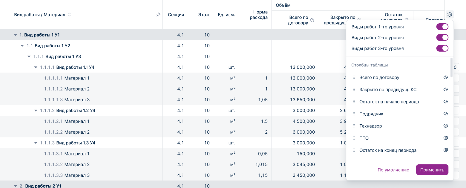 Все настройки, связанные с конфигурированием системы, будут сохраняться в рамках текущего акта. Для сброса всех настроек нужно нажать на кнопку «По умолчанию» в блоке «Настройки».