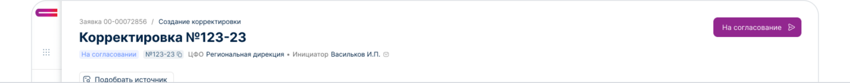 После отправки корректировки на согласование изменится статус на «На согласовании корректировки» и будет отображаться номер, дата корректировки. При нажатии на них можно провалится в корректировку, чтобы проверить какой у нее статус