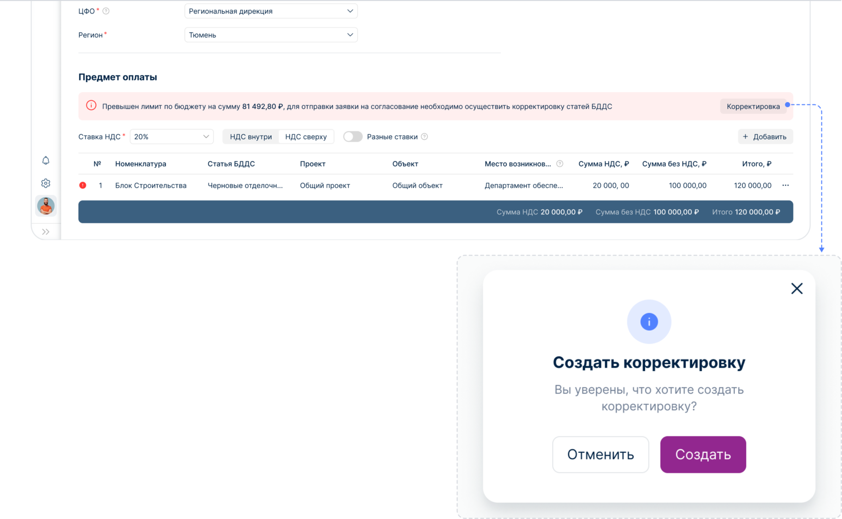 При превышении лимита по бюджету в процессе заведения заявки у вас появится соответствующее уведомление о том, что вы превысили лимит и на какую сумму. В табличной части в предмете оплаты появится красный круг с восклицательным знаком. В таком случае для того, необходимо сделать корректировку