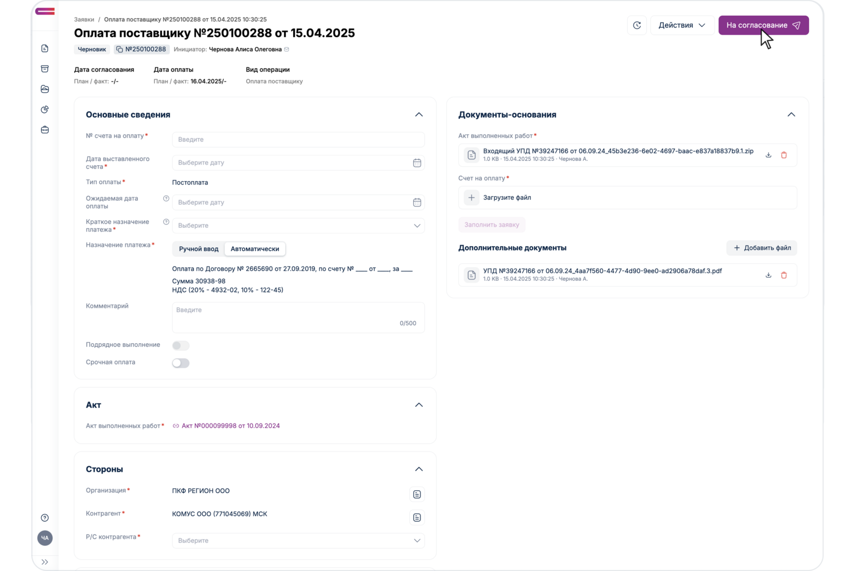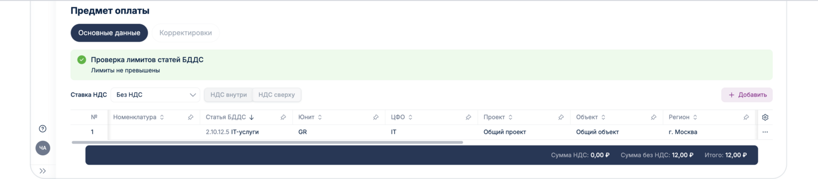 Если лимиты превышены отобразится соответствующее уведомление: «Превышен лимит по бюджету». При превышении лимита заявка отправится на согласование Бюджетному контролеру, где он непосредственно может как изменить статью БДДС, скорректировать бюджет, так и отклонить заявку в связи с неверно отраженным Юнитом в заявке. После создания корректировки Бюджетным контролером, заявка переходит на согласование «Ответственному за Юнит».
