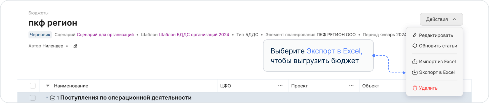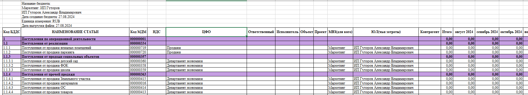 Для получения шаблона Организации иным путем, экспортируйте пустой бюджет Организации в Excel и заполните информацию по статьям построчно