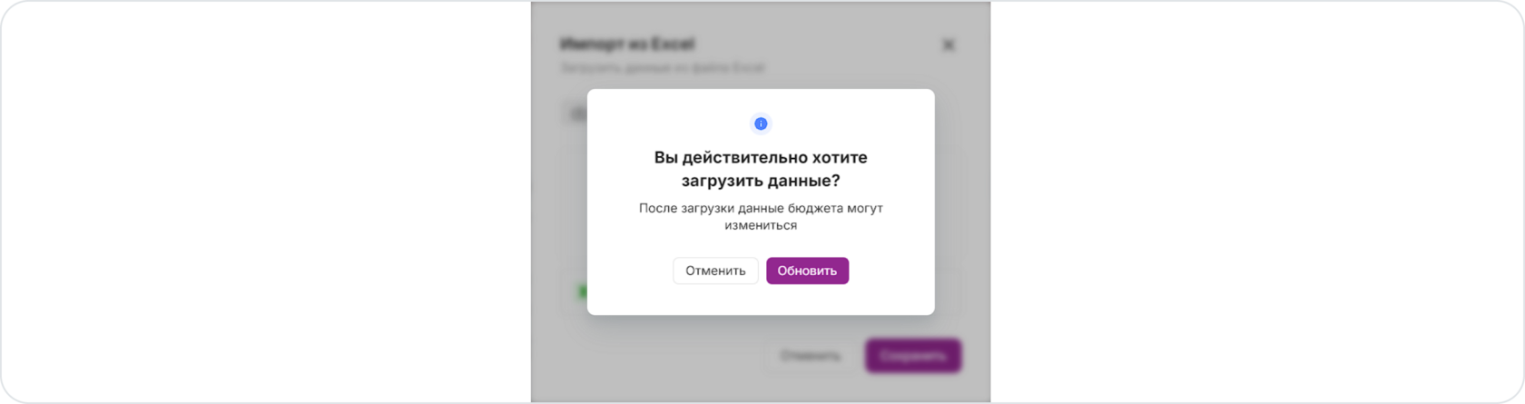 На экране появится модальное окно с уточнением необходимости загрузки. Нажмите на кнопку Обновить, чтобы запустить процесс загрузки данных из файла в бюджет организации.