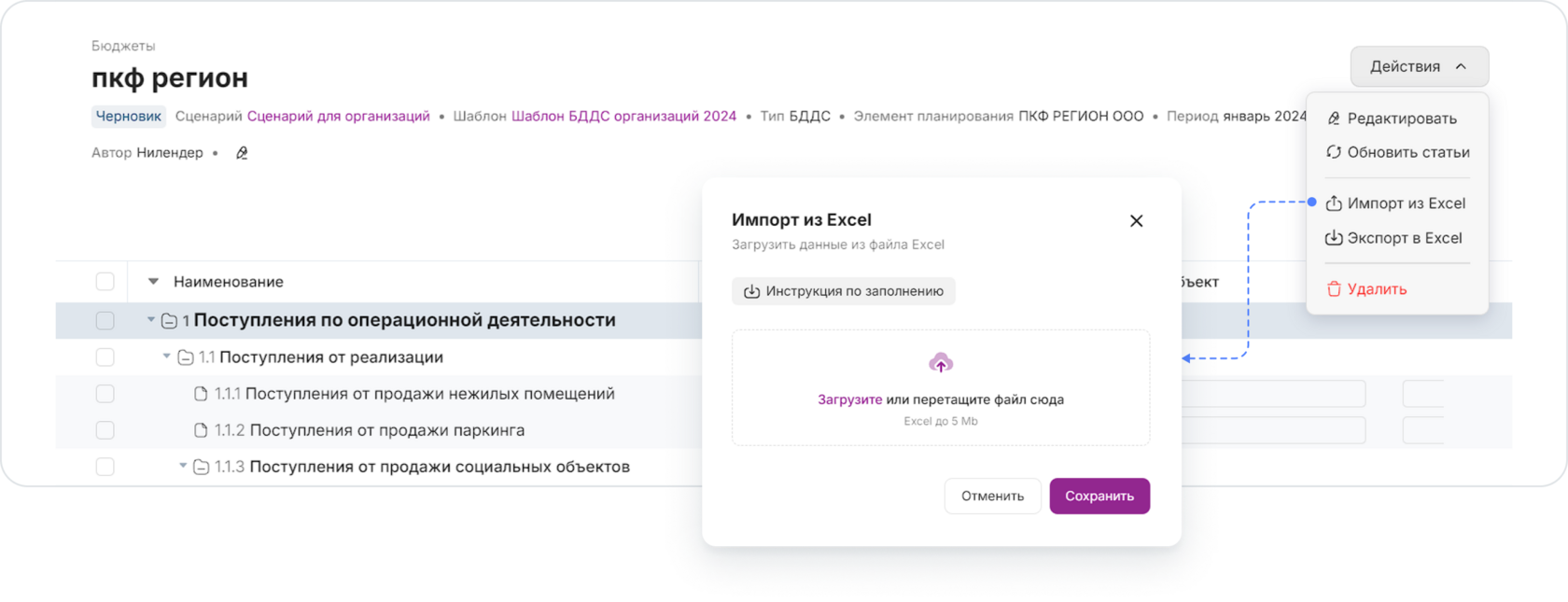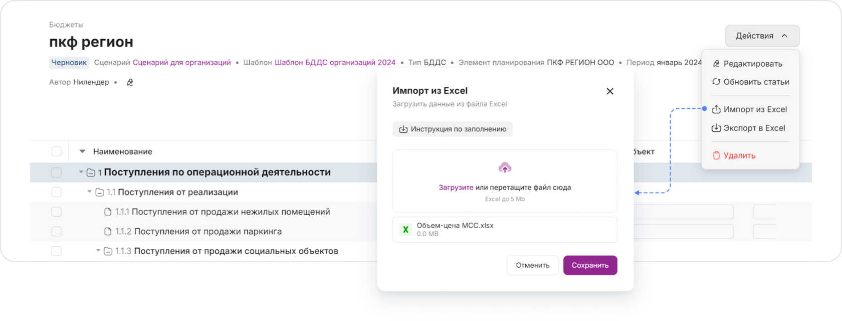 При нажатии на кнопку Импорт из Excel появится модальное окно с вариантами загрузить файл бюджета или перетащить файл из папки
