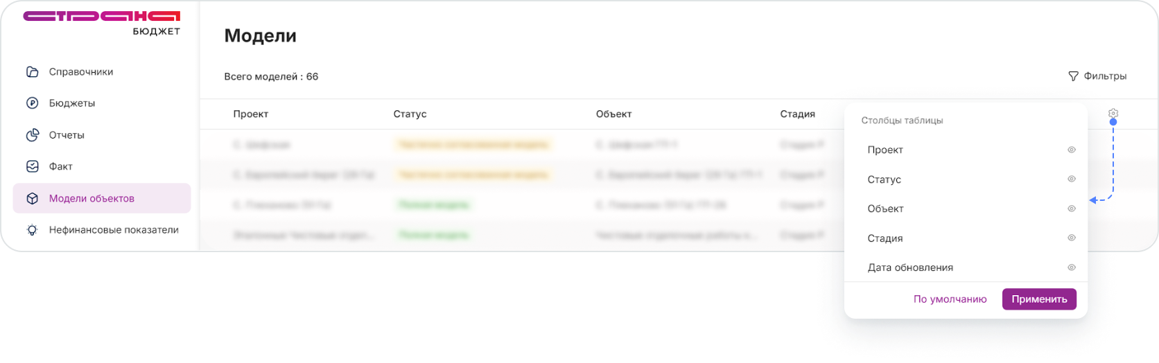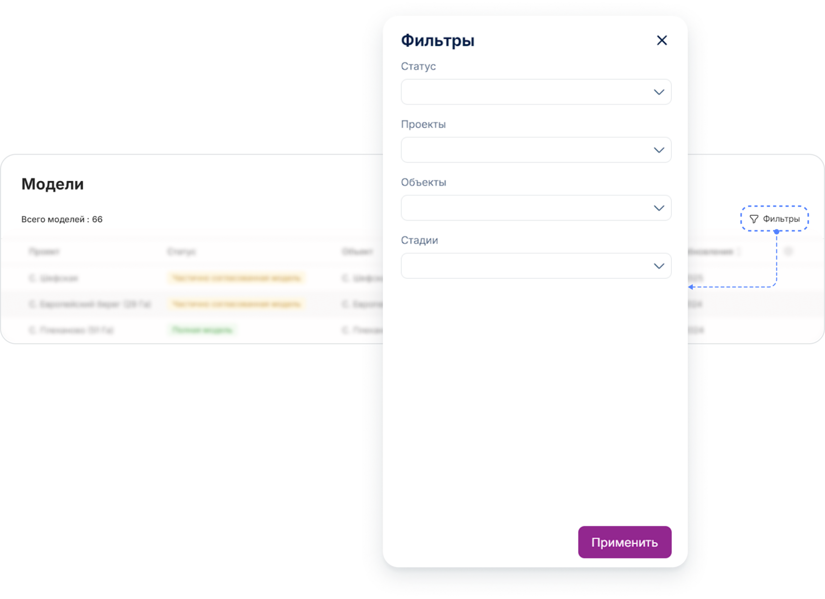 В открывшемся окне выберите необходимые фильтры по Статусу модели, Проекту, Объекту и Стадии строительства и нажмите кнопку