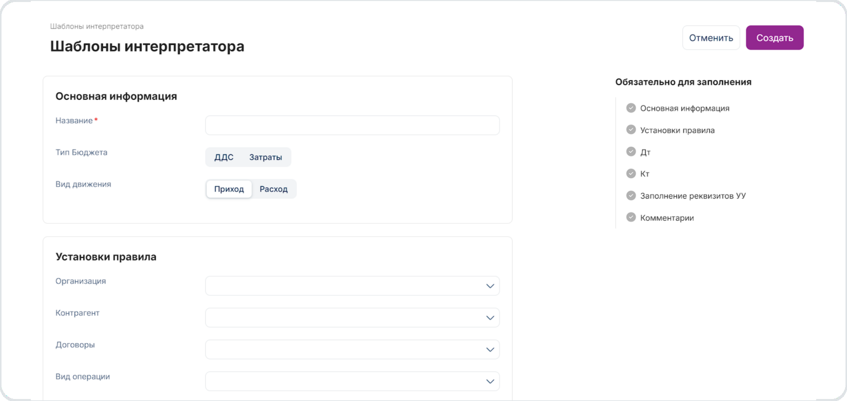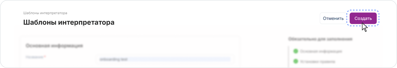 После заполнения обязательных полей, сохраните шаблон, нажав на кнопку Создать в правом верхнем углу.