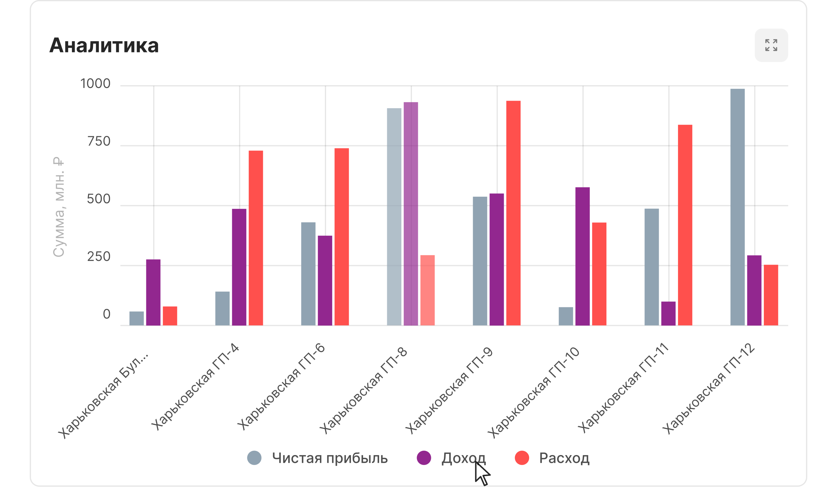 Для просмотра статей бюджета ниже по иерархии можно использовать панель раскрытия всех статей бюджета или воспользоваться элементом раскрытия только одной группы (стрелочка слева от названия статьи)