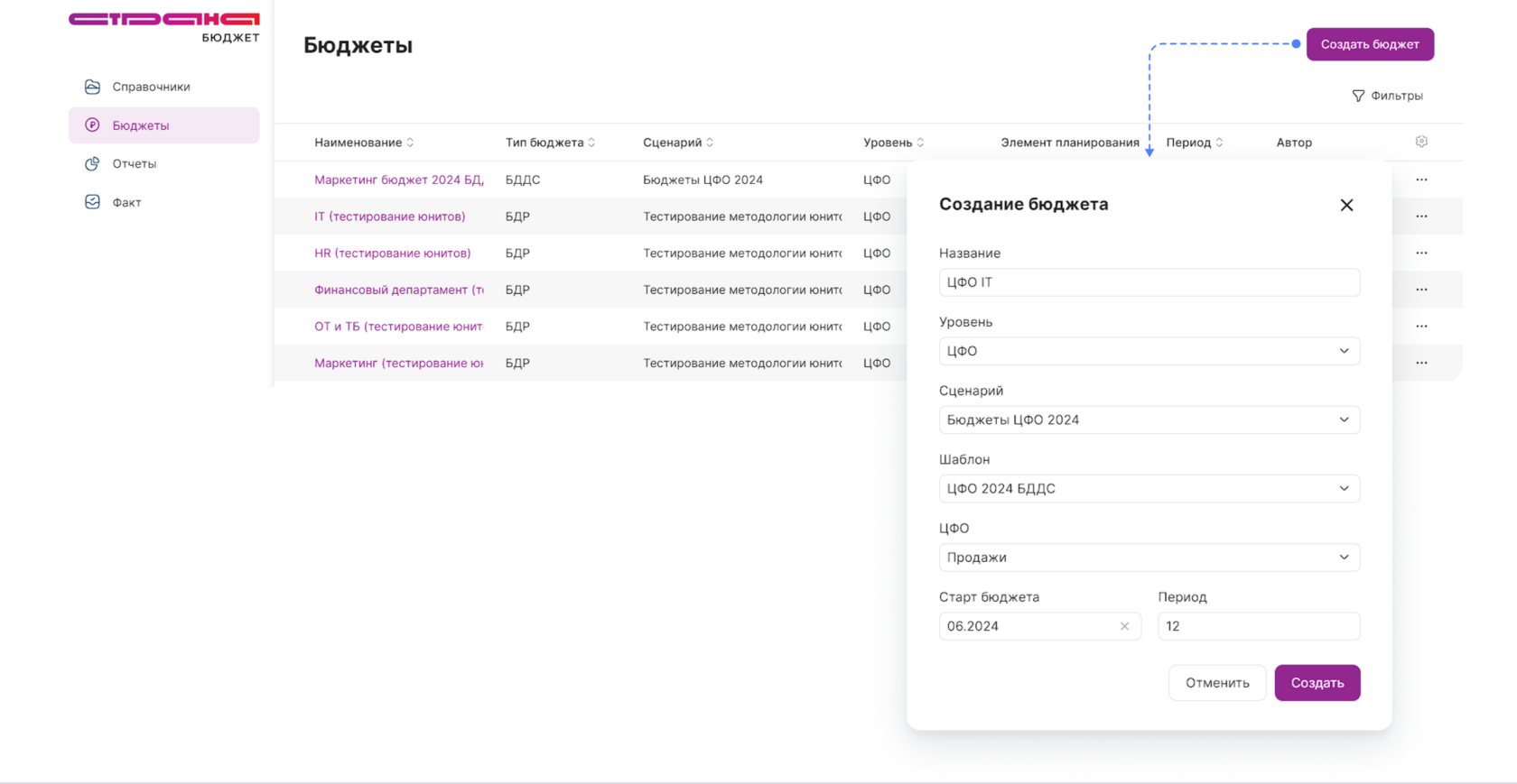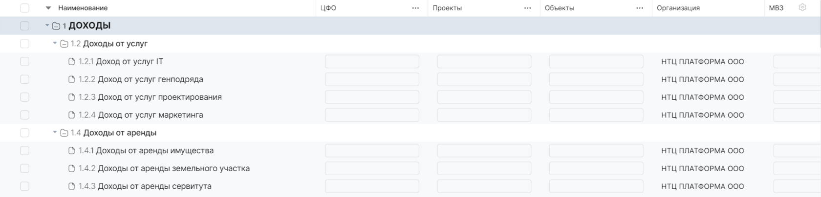 В разделе Бюджеты будет отображаться список бюджетов, созданных в системе по уровням ЦФО или Объект