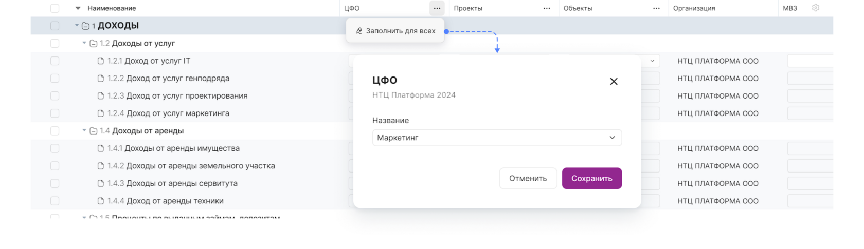 ЦФО — выберите ЦФО, по которому планируете заполнить бюджет