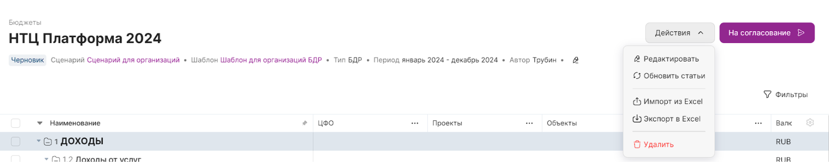 Для импорта бюджета из Excel или удаления созданного бюджета необходимо открыть меню Действия